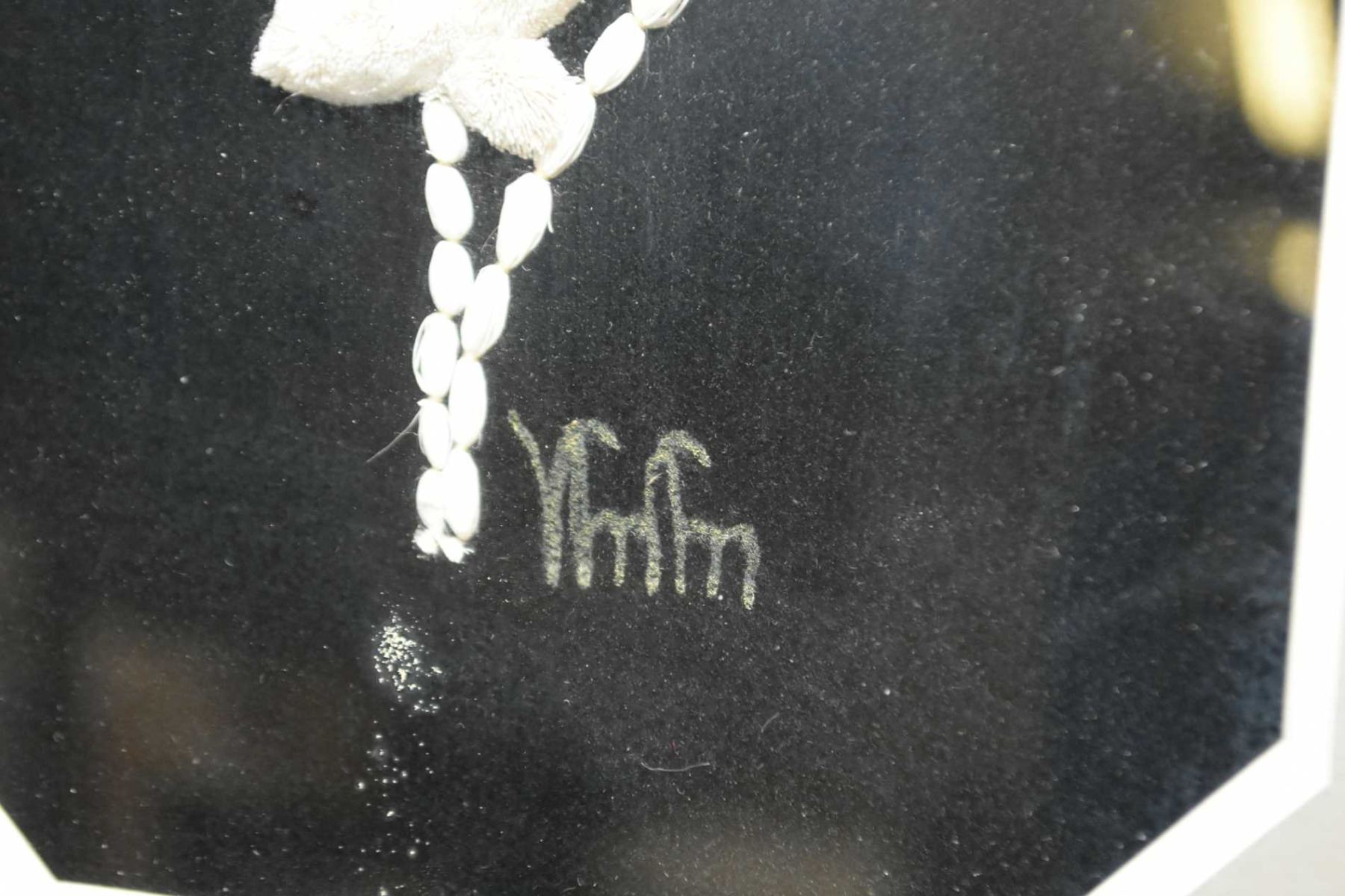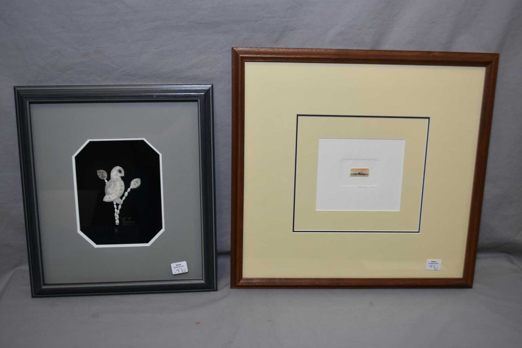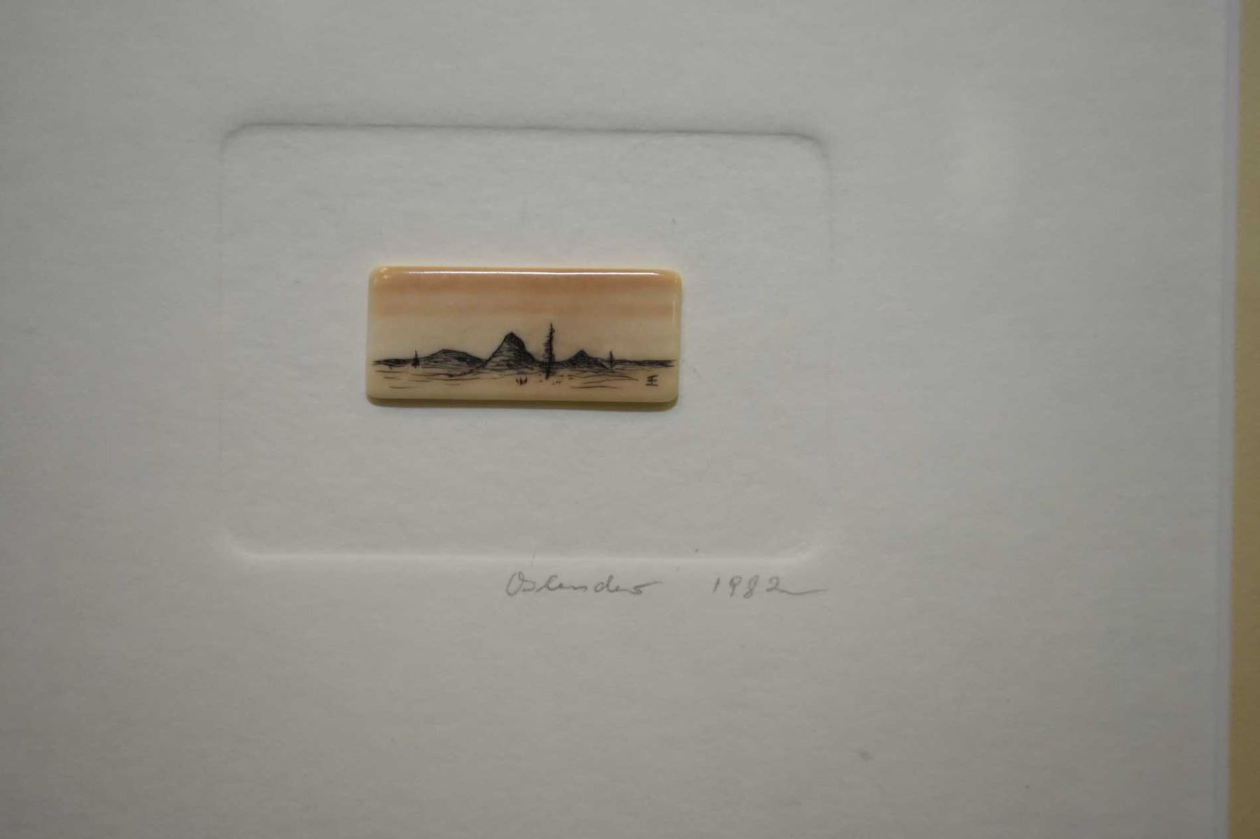 Framed moose tufted bird on a stalk and a framed piece of scrimshaw signed by artist Oslender 1982