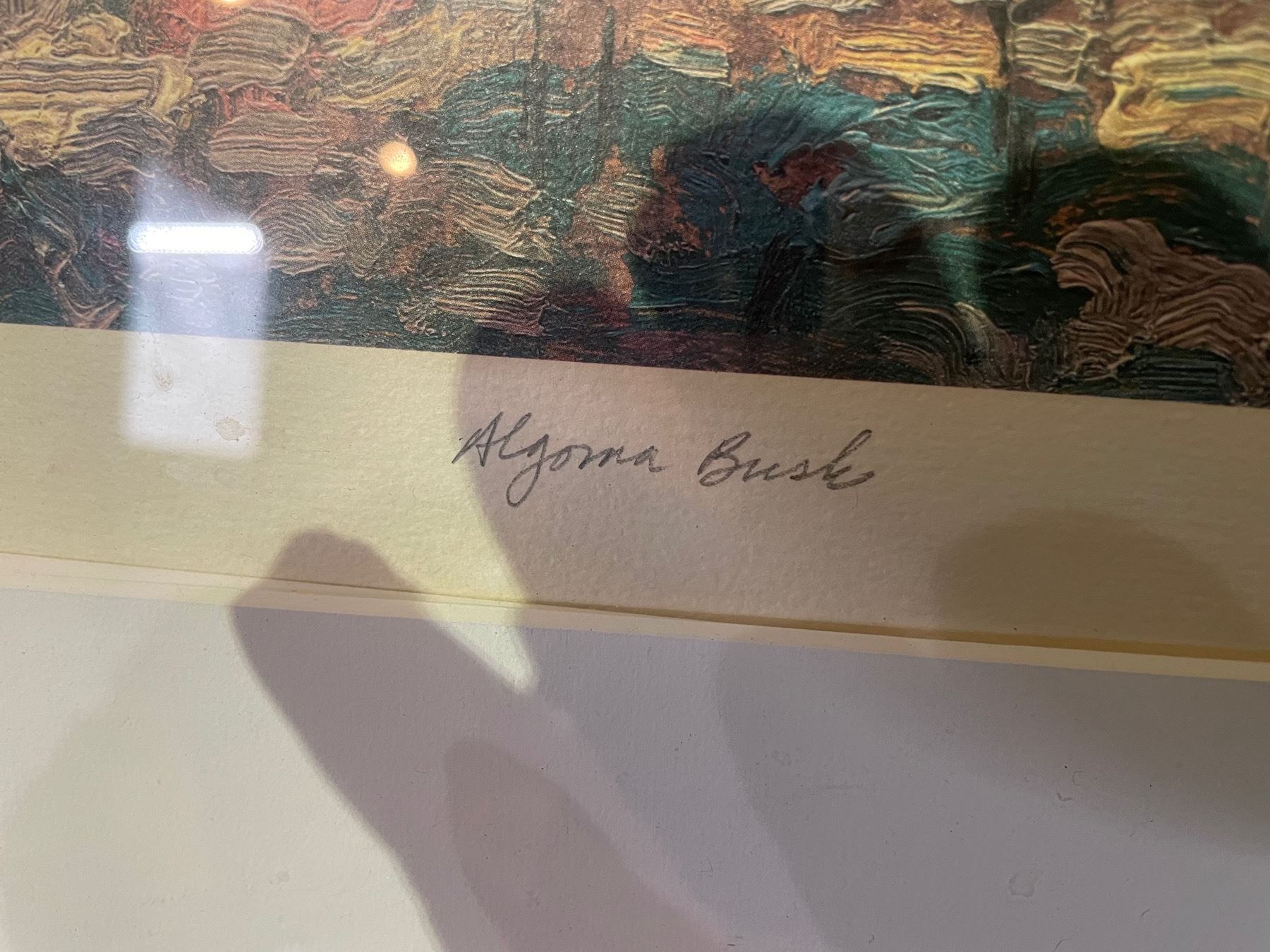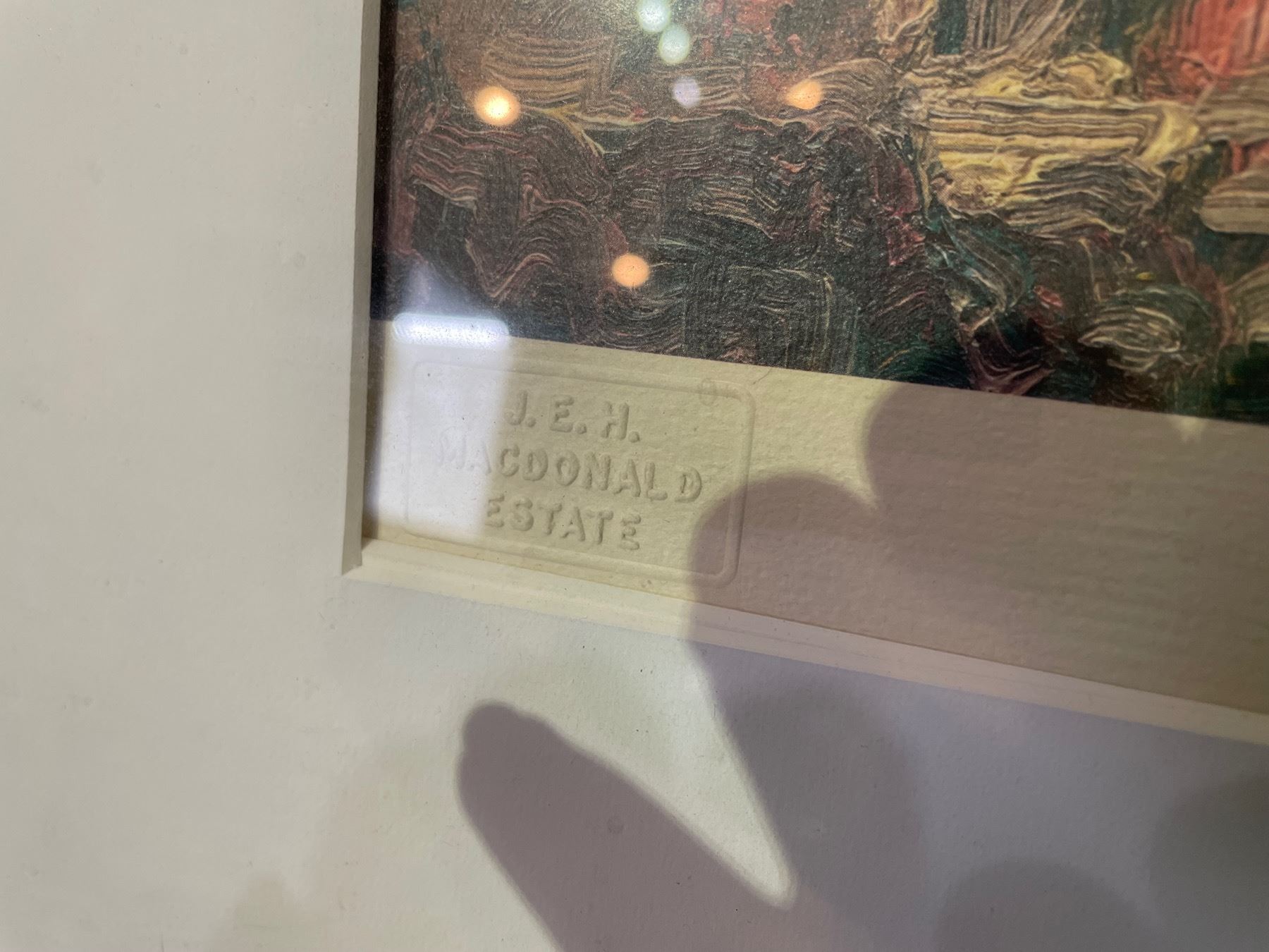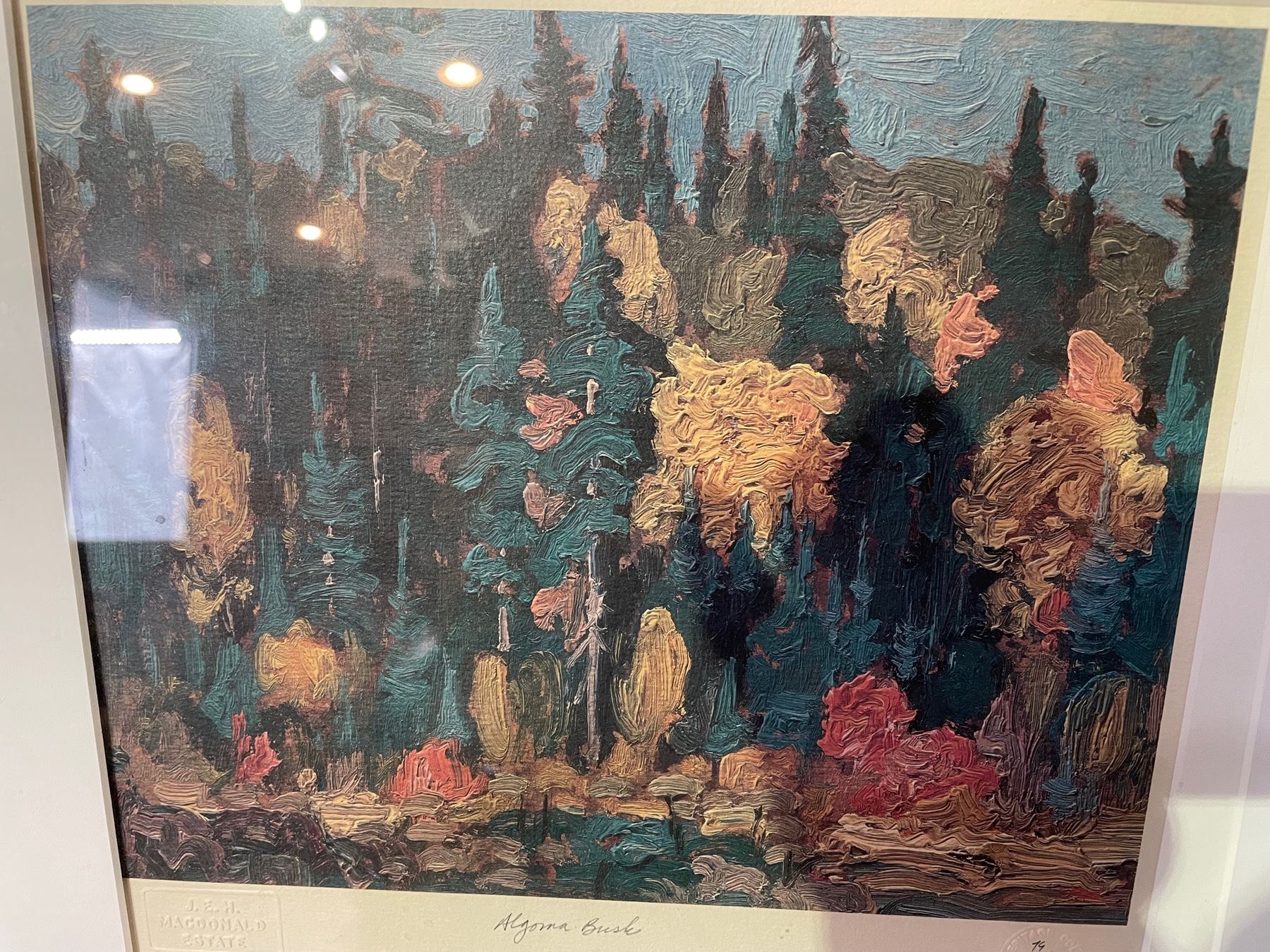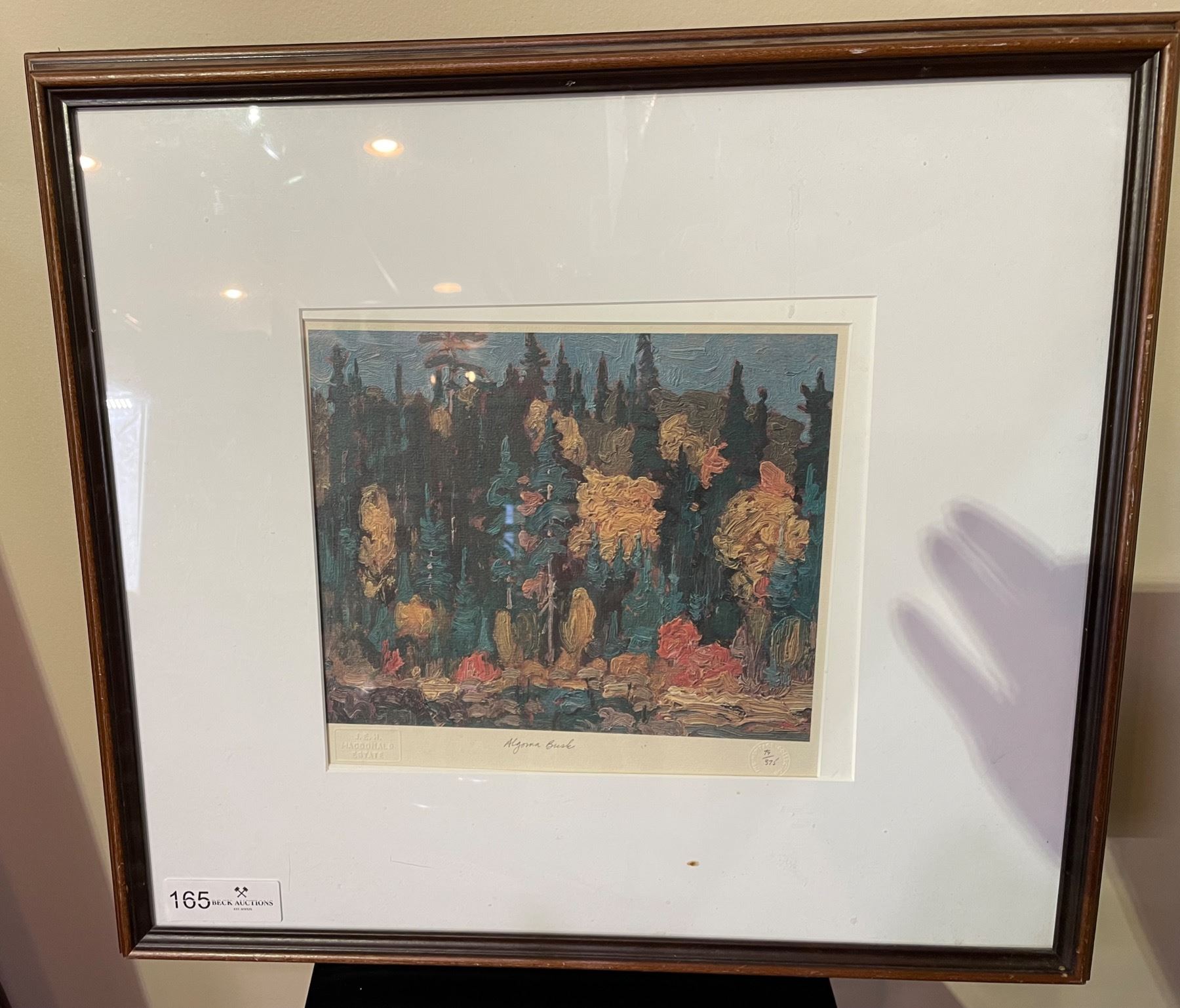 Numbered 79/375 signed print embossed with J.E.H MacDonald Estate "Algoma Bush". Wood frame. Measures 22 inches wide x 20 inches tall.