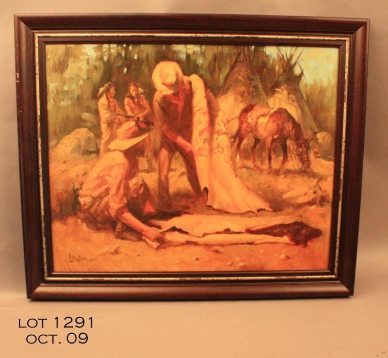 Framed oil on canvas painting of Indians and two frontiersmen conducting a trading session for painted hides and a rifle, by L. Taylor, approx. 29” X 35” in overall very good condition showing nice composition and color. Est.: $1,000-$2,000.