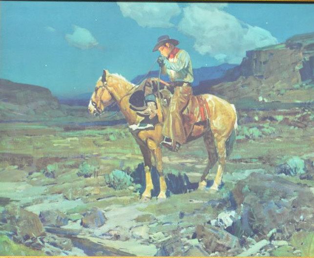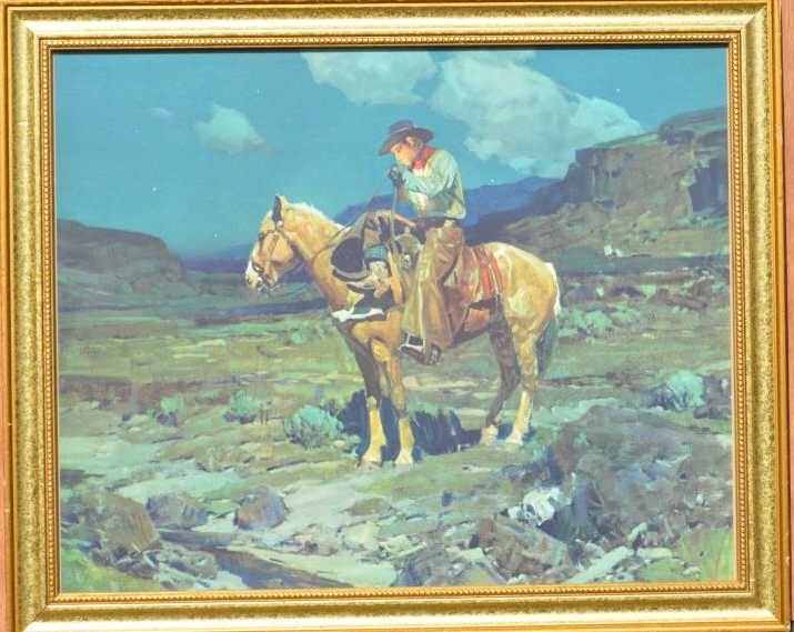 Framed original Frank Tenney Johnson print entitled “Guardian of the Herd”, 1936; from the Johnson estate. Est.: $75-$125.