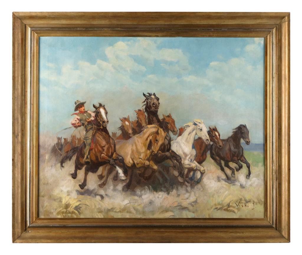 Framed original oil on canvas of a cowboy on horseback working a herd of wild horses signed “Viski J”; approx. 30” x 36” overall and in good condition. Janos Viski (1891-1987) is a listed artist, known for his love of the Old West, Cowboys and horses. A well-done oil with great depiction of movement and expressions on the faces of the wild horses. Est.: $1,000-$2,000.