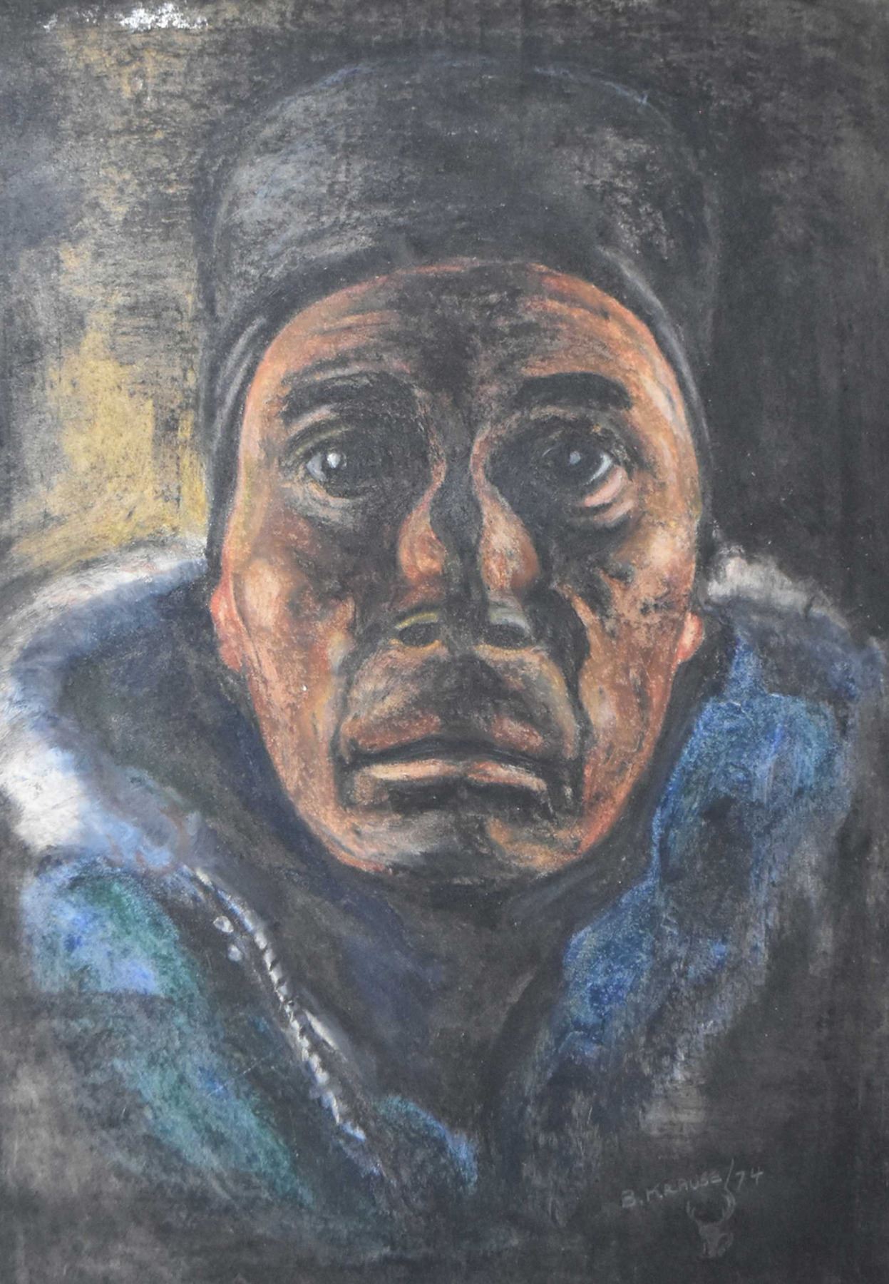 Framed original pastel on paper portrait of a Inuit figure signed by artist B. Krause '74, 16" X 11"