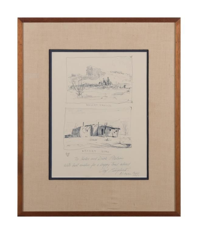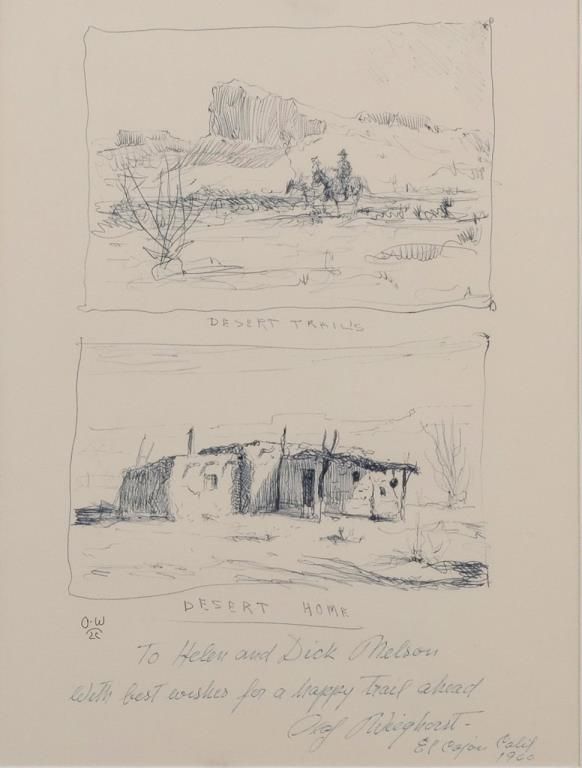 Framed pen and ink sketch, signed by prominent Western artist Olaf Wieghorst, presented and dated 1960, showing desert trails and desert home, “to Helen and Dick Nelson” who were close friends and known collectors. Shows the “OW” initials and 2Cbrand; approx. 12-1/2” x 9”, nicely framed and matted. Also, the paper sheet has other sketches on the back showing cowboys, chuck wagon and horses. Olaf Wieghorst was America’s foremost Western artist in his lifetime who had a long andstellar career in Western art. He was originally a child acrobat and performer in his native homeland of Sweden and became enamored with the West when he snuck under the tent to view Buffalo Bill’s Wild West Show. He immigrated to Americain the early 1900’s and became a top Cavalry soldier stationed along the Texas and New Mexico borders during the Mexican Revolution in the 1915-1920 era. Widghorst was especially talented in trick riding and had a magnificent gift fordealing with horses, which he carried to New York City where he became a policeman in charge of handling mounts for the New York Mounted Police. Wieghorst moonlighted during the Depression as an artist and was constantly reprimanded for