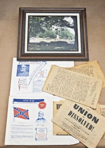 Framed photographic print of Civil War monument with canons by John H. Ansley, approx. 11” by 14”. Nicely framed. Good condition. Along with reproduction Civil War maps, declarations, and other 1960’s commemorative printings. On authentic type paper. 6 pieces total. Est: $25 - $50