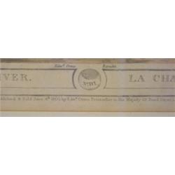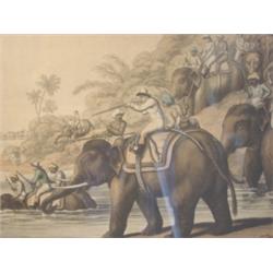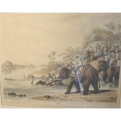 Framed print entitled "Chasing a Tiger Across a River" with hunters on elephants in African landscape. "Published and Sold June, 4 1805 by Edward Orme. Printseller to His Majesty 59. Bond Street London." Some damage to lower part of frame. 26 1/2" x 24" framed.