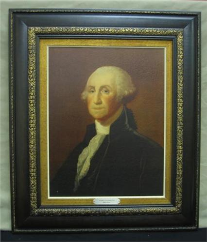 The name Gilbert Stuart noted as the artist. A label on the back says "An American Masterpiece" by Aaron Brothers of California, TG-38-C. Including the frame this item is 27" tall and 23" wide.