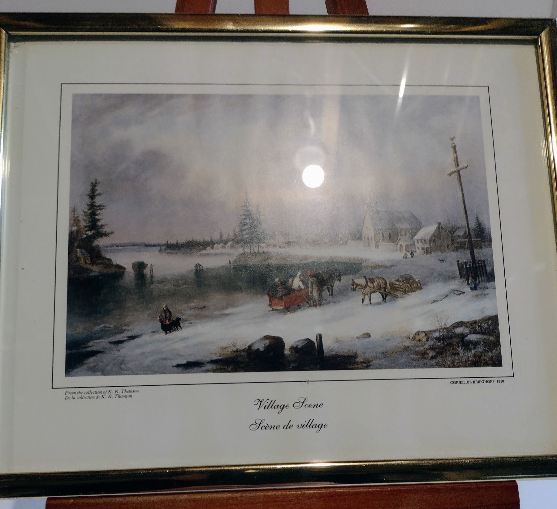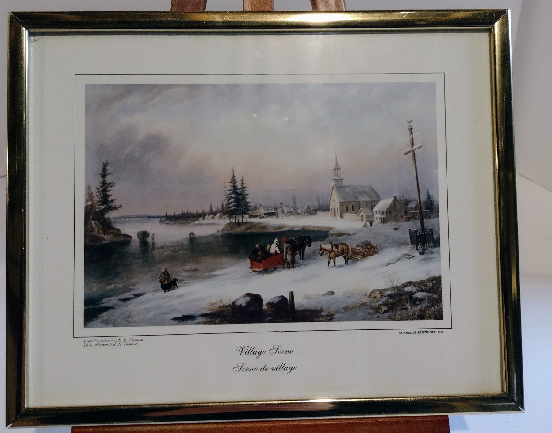 Framed print of a Quebec scene entitled “Village Scene.” Artist Cornelius Krieghoff, 1850. 10 ½ inches in length, 8 ½ inches in width.