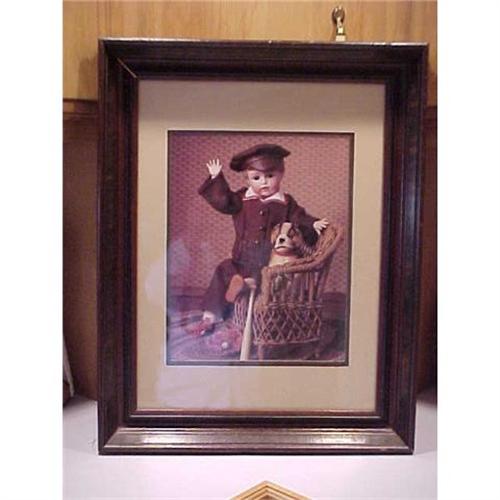 This is a framed print of an adorable character toddler bisque head doll from probably the early 1900's. The print, matting and glass are in very good condition. The frame is old walnut I think and need a good cleaning and waxing. There are some bruises on it that should cover well with some wood scratch remover. On the top of the frame there is a narrow 6" split that was done in the making and does not show when hung. The back needs new paper as I had to remove it to check for marks and dates. There is a printed mark in one corner but too smudged to read. This would be so cute in a doll collector's doll room. The marks and shadows on the picture were made by the camers. His hat has no white spots and what you see is my shadow.It is heavy wood and glass so will be more than usual to ship. Check before buying.