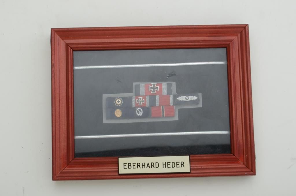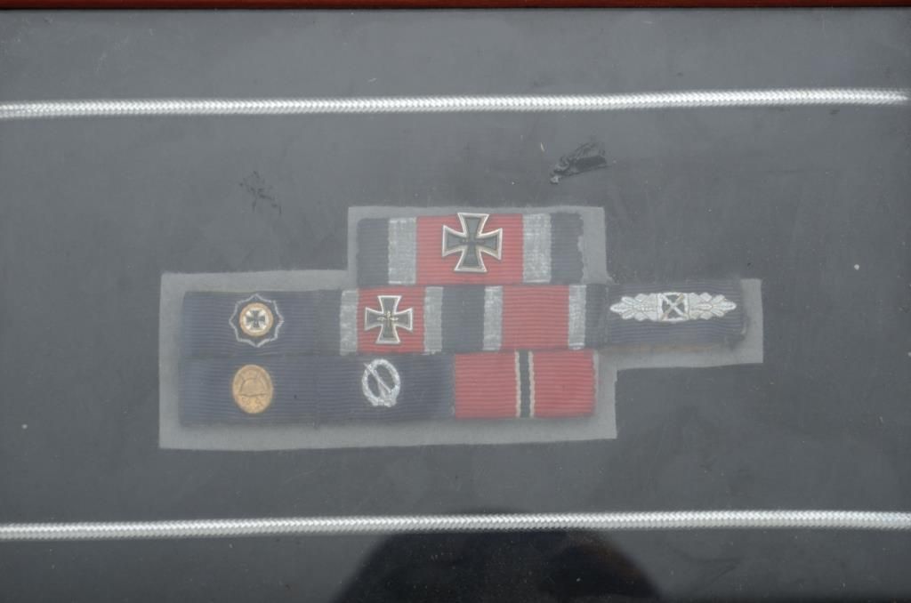 Framed ribbon bars of Eberhard F. Heder, Commanding Officer of the 5th SS Pnazer Battalion who was awarded the Knights Cross on Nov. 18, 1944 for resistance against attacks in Warsaw, Poland against theRussians. Est.: $100-$150.