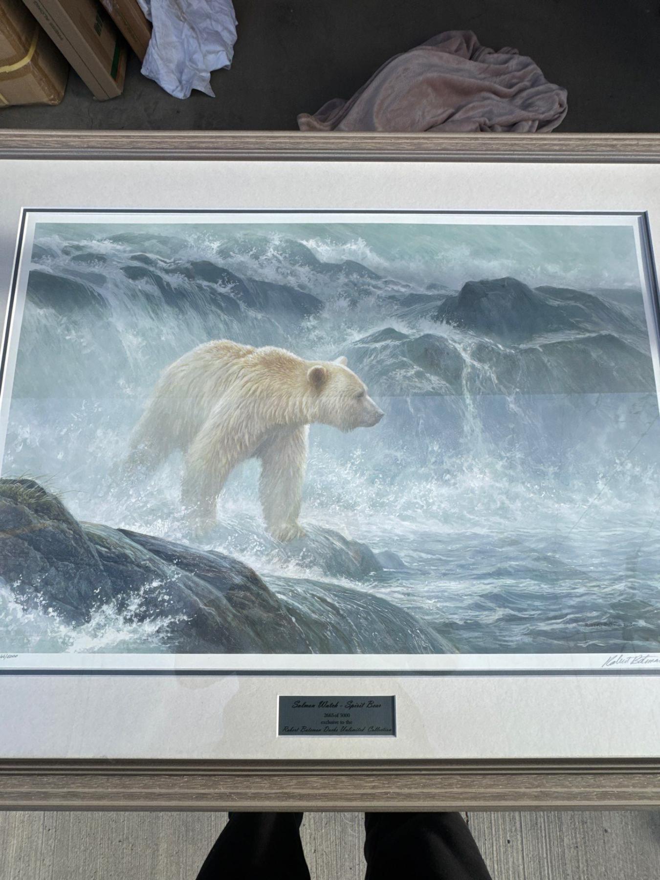 Framed salmon spirit bear salmon watch number two six six five of 5,000 exclusive to the Robert Bateman Ducks Unlimited collection. Nicely framed. 43 and threefour wide by 33 and a half long.