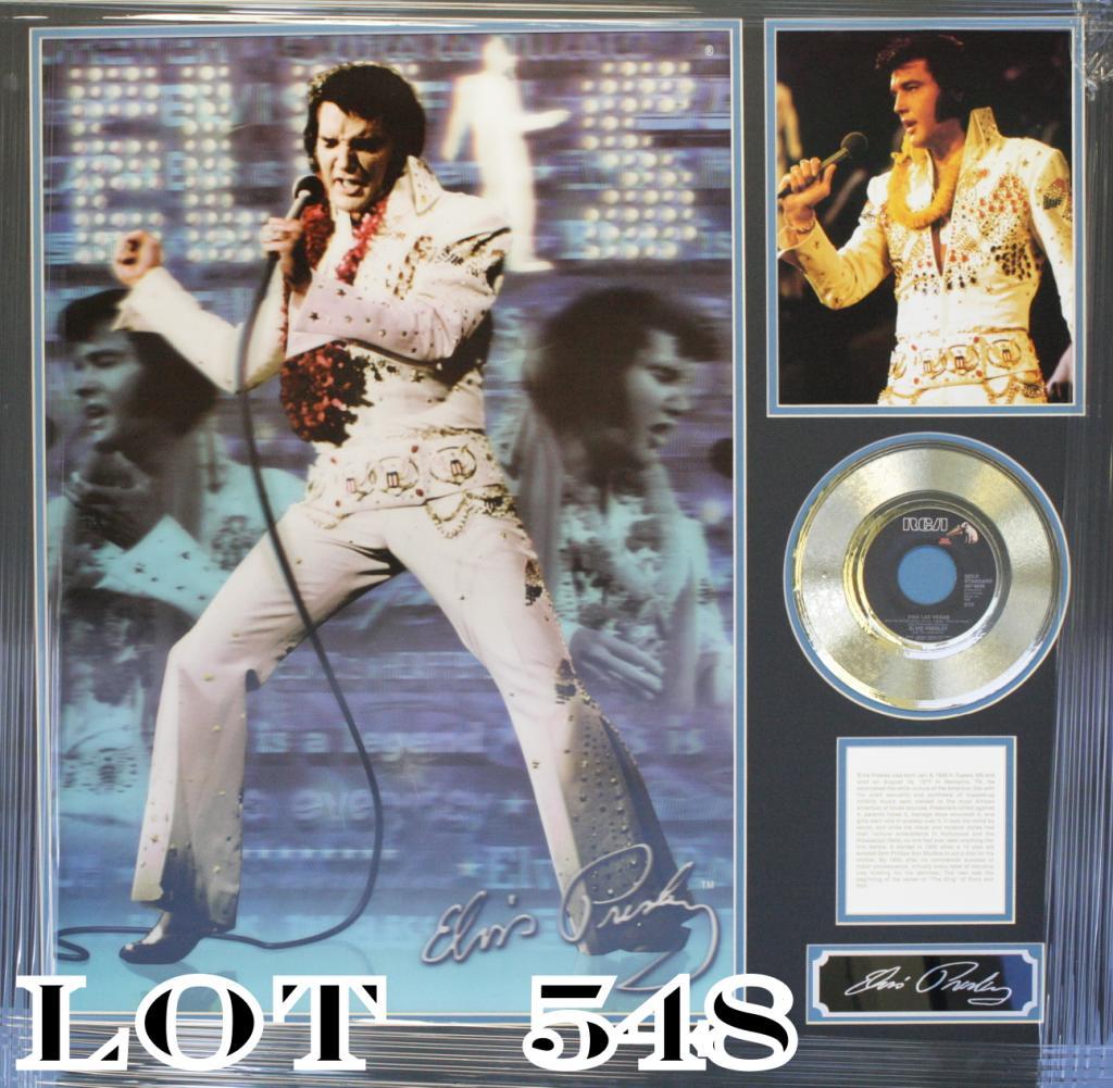 Framed salute to the “King”, Elvis Presley, approx. 33” x 33” and including a three dimensional picture of Elvis that moves as the viewer changes position in front of the framing, a photo of Elvis with microphone, agold RCA 45 RPM record entitled “Viva Las Vegas”, a facsimile of his signature and a brief summary of his extraordinary musical career. A great tribute to one of the all time Rock and Roll greats! Est.: $300-$600.