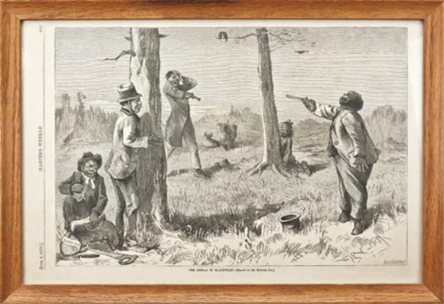 Framed section from Harper’s Weekly, July 8th 1878, approx. 10-3/4” by 15-1/2”, nicely framed, artwork entitled the Duel in Blackville by W. H. Retting. Shows two black men dueling in somewhat comical and demeaning fashion. From the William R. Orbelo Collection. Est: $150 - $300