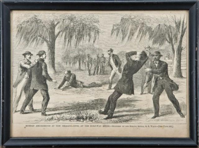 Framed section from Harpers weekly, 1856, approx, 6-7/8” by 9-1/2” entitled Sunday Amusements at New Orleans. Shows men dueling, sketched by artist Waud. From the William R. Orbelo Collection. Est: $50 - $100