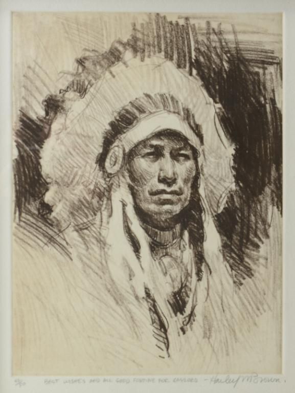 Framed sepia toned limited edition (42/50) etching of an Indian Chief, signed by noted Western artist Harley Brown with presentation "Best wishes and all good fortune for Gaylord", image size approx. 12" x 9" andbeautifully accomplished. Born in 1939, Brown studied art in Canada and England and early in his career was commissioned to paint England's Prime Minister Winston Churchill; he has garnered an impressive following andcontinues to create his signature style of works from his studio in Arizona. From the estate of the owner of Clearwater Publishing. Est.: $150-$250.