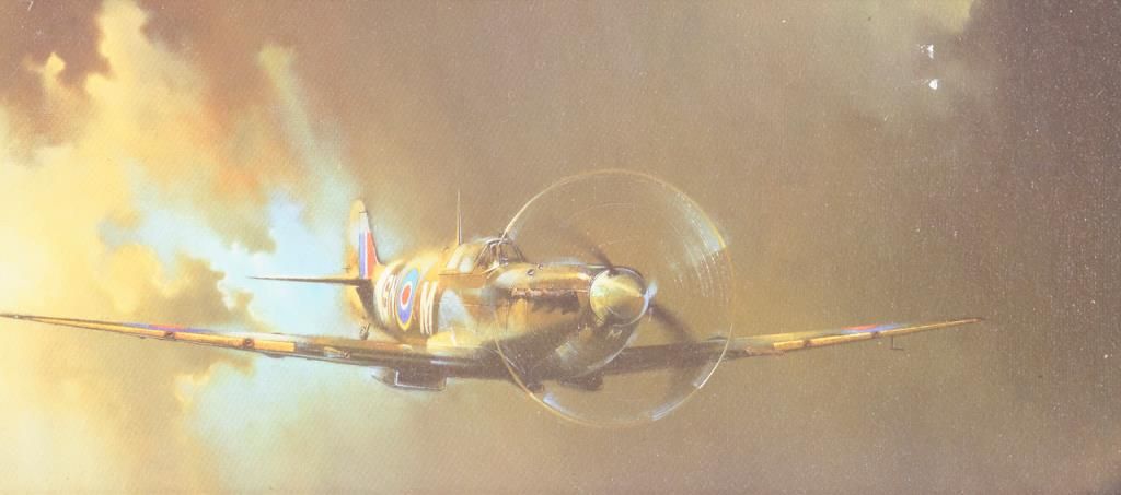 Framed small size painting on canvas by Barrie Clark entitled “Spitfire”, approx. 10” x 17” overall of the scrappy British fighter plane of WW II; nicely accomplished. Est.: $150-$300.