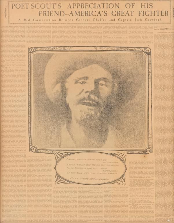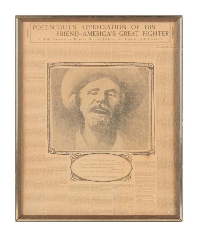 Framed un-dated newspaper article entitled “Poet-Scout’s Appreciation of His Friend---America’s Great Fighter . . . . A Real Conversation Between General Chaffee and Captain Jack Crawford”; approx. 21” x 17” in overall goodcondition showing slight yellowing but completely readable; covers their meeting at Governor’s Island after Chaffee’s return from service in China and their reminiscent discussions about the Indian Wars, etc. Est.: $500-$1,000.