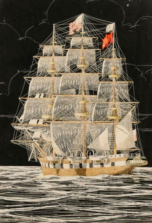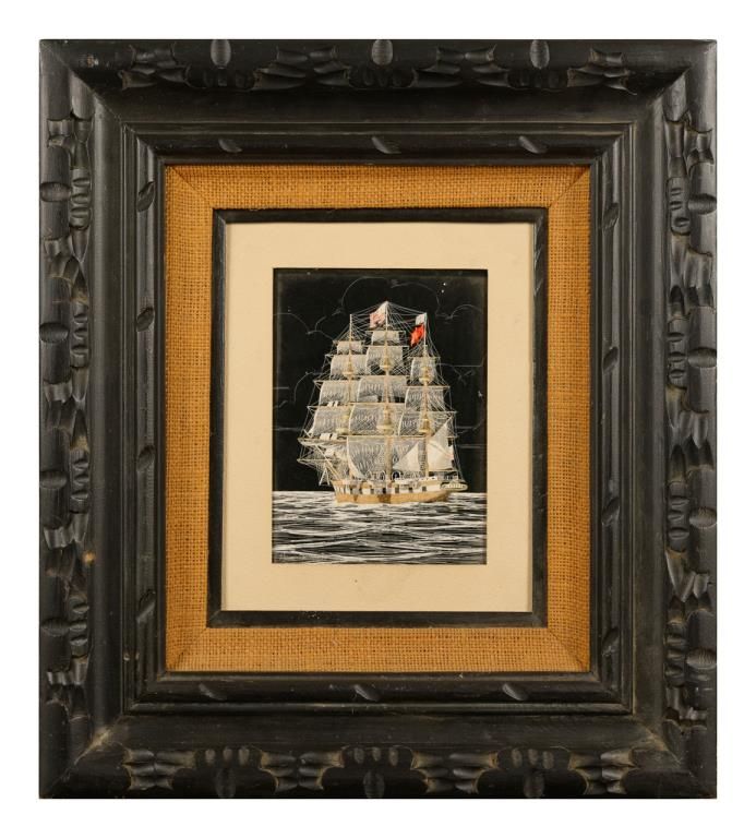 Framed vintage scratchboard etching by Reid Mason entitled “Early 19th Century Whaler”; overall approx. 18” x 16”. Est.: $25-$50.