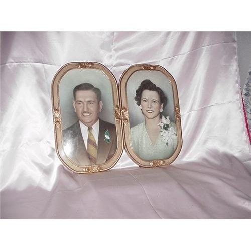 Pair of brass frame 10" x 16" with bubble glass. Hand colored photos.