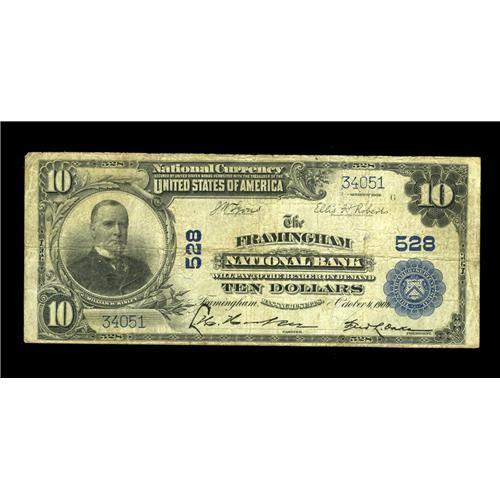<B>Framingham, MA</B></I> - $10 1902 Plain Back Fr. 624 <B>The Framingham NB</B></I> Ch. # 528<BR>This evenly circulated note becomes the fourteenth note off this tough Middlesex county bank. <B>Very Good.</B></I>