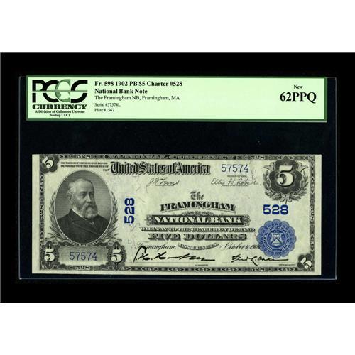 <B>Framingham, MA</B></I> - $5 1902 Plain Back Fr. 598 <B>The Framingham NB</B></I> Ch. # 528<BR>A bright <B>PCGS New 62PPQ</B></I> that would likely have been certified at least a point or two higher with a bit more top margin. The color is exceptionally strong and the stamped officers' signatures are vivid and fully legible.<BR><I>From The Bill and Kathy Stella Currency Collection</B></I><BR><BR><b>Shipping:</b> Coin/Currency (<a target="_blank" href="http://www.heritageauctions.com/common/shipping.php">view shipping information</a>)