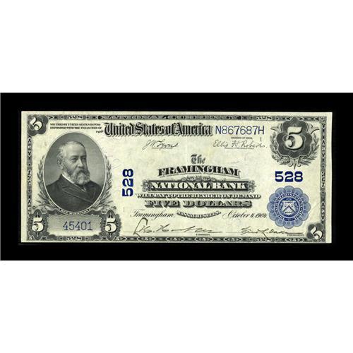 <B>Framingham, MA</B></I> - $5 1902 Plain Back Fr. 598 <B>The Framingham NB</B></I> Ch. # 528<BR>From a community well known in medical circles for a pioneering study of heart disease initiated here in 1948 under the sponsorship of the National Heart, Lung and Blood Institute and tracking more than 5,000 local participants. Tonight's <B>Extremely Fine</B></I> offering is one of just five $5 Plain Backs documented from this issuer. <BR><I>From The Bill and Kathy Stella Currency Collection</B></I><BR><BR><b>Shipping:</b> Coin/Currency (<a target="_blank" href="http://www.heritageauctions.com/common/shipping.php">view shipping information</a>)
