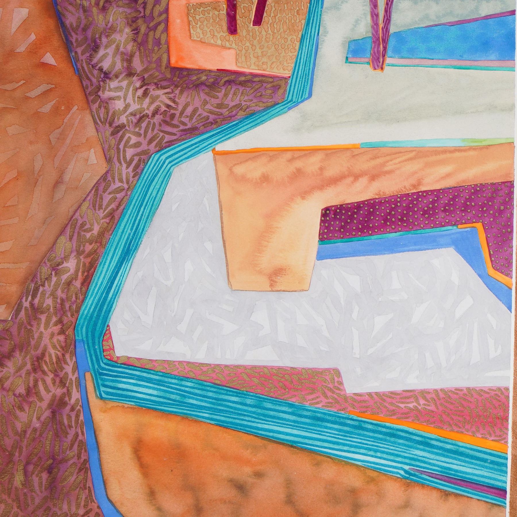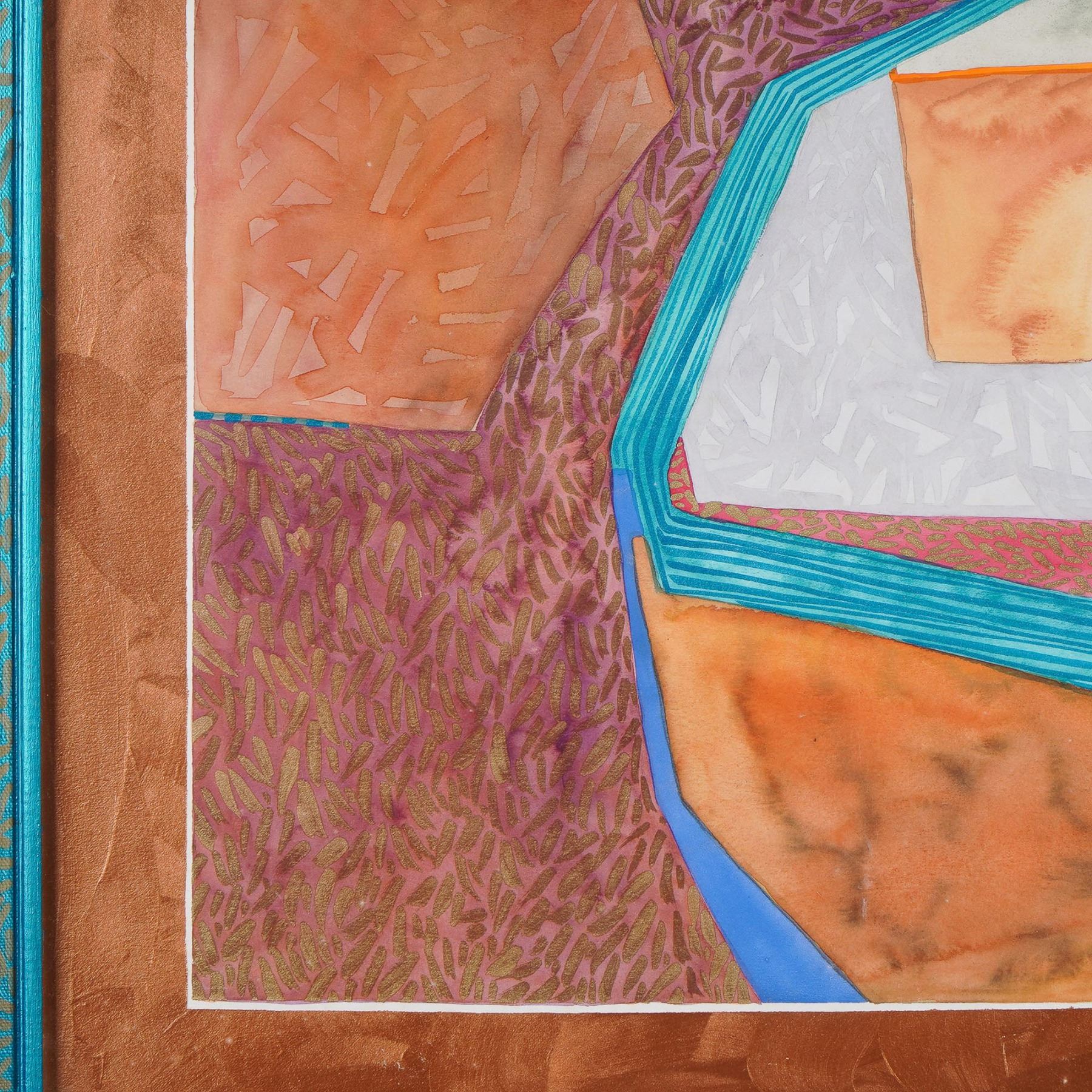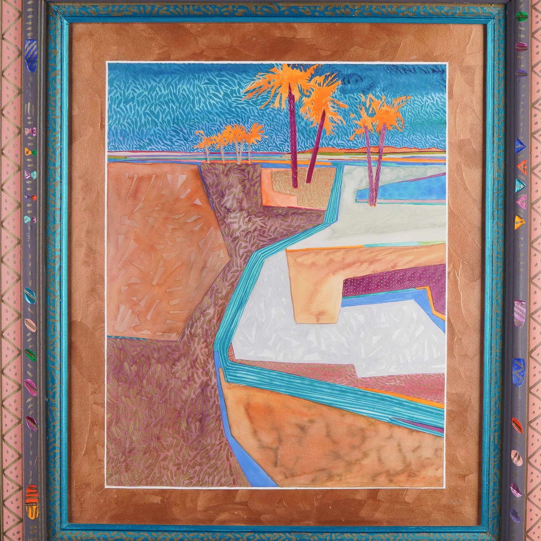 A vibrant Southwestern watercolor by artist Fran Larsen, titled Sea of Grass. Characteristic of the New Mexico art scene, her composition bursts with expressive color and abstracted desert landscape forms. The painting features a patchwork of vividly rendered terrain and stylized palm trees, layered with metallic gold highlights and bold, rhythmic brushwork. Larsen's work blends Southwestern imagery with modernist sensibilities, creating a lively, almost surreal visual experience. This work is housed in a custom hand-carved and painted frame that mirrors her artwork's dynamic palette and geometric motifs, reinforcing the bold visual harmony. Signed, titled, and dated en verso. Original gallery label on the reverse lists the retail price of $1,800. On lower right edge: Larsen.