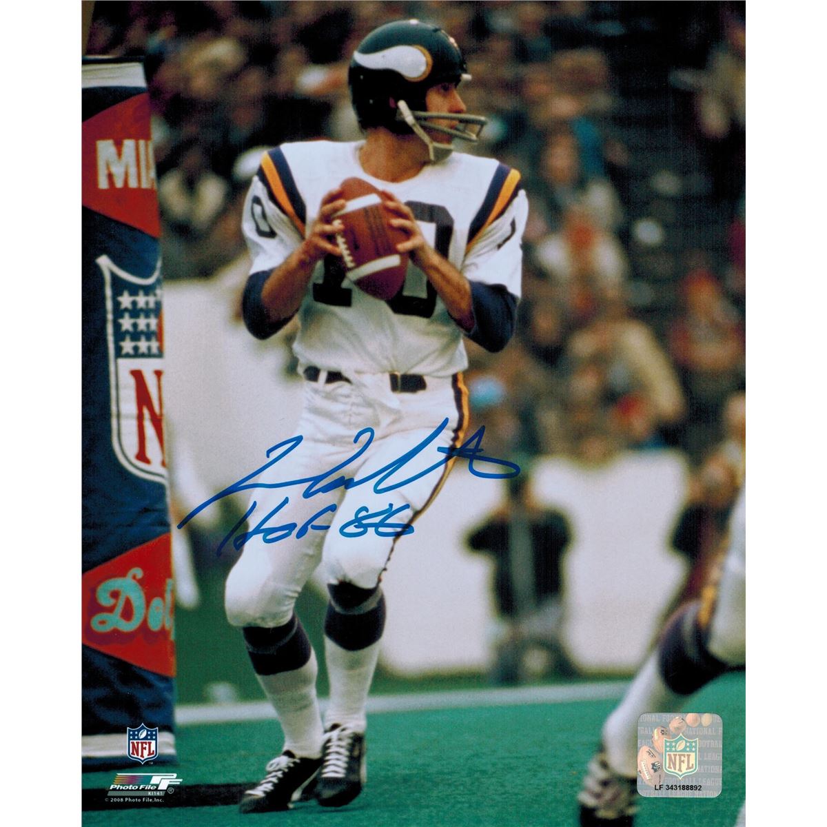 Fran Tarkenton signed Vikings action 8x10 photo with HOF 86 inscription. Item comes with a Schwartz Sports Memorabilia tamper-proof numbered hologram and Certificate of Authenticity which can be verified online.