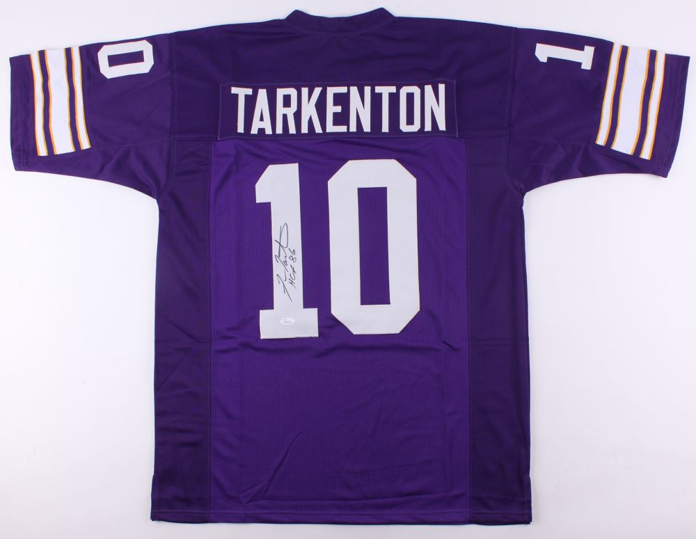 Custom on-field style jersey. Everything sewn on, size XL. Hand-signed and inscribed in black felt tip pen by Fran Tarkenton.