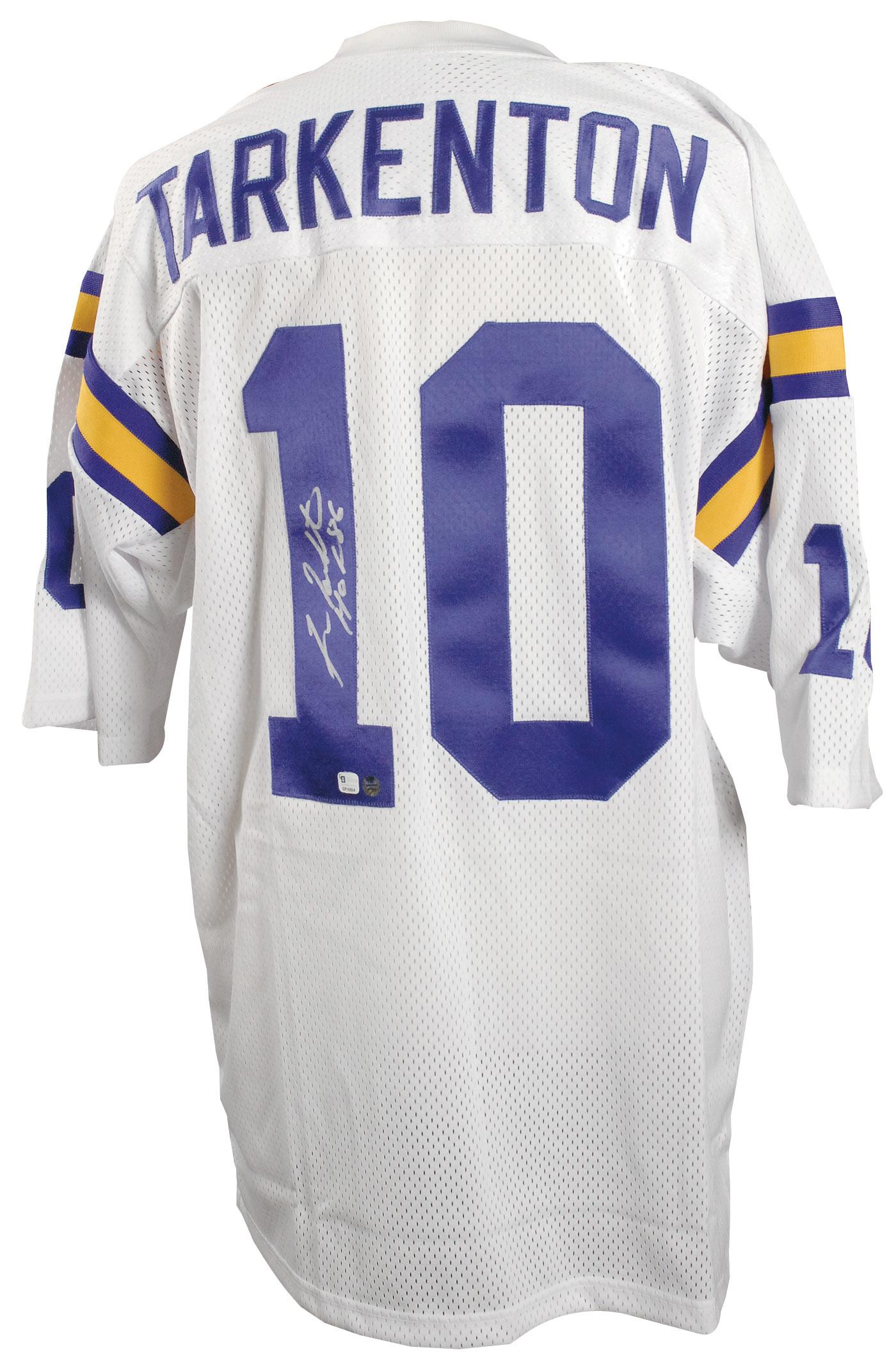 Replica Minnesota Vikings football jersey, with sewn on letters and numbers, signed in silver ink on the number on the back, “Fran Tarkenton HOF 86.” In very fine condition.
