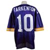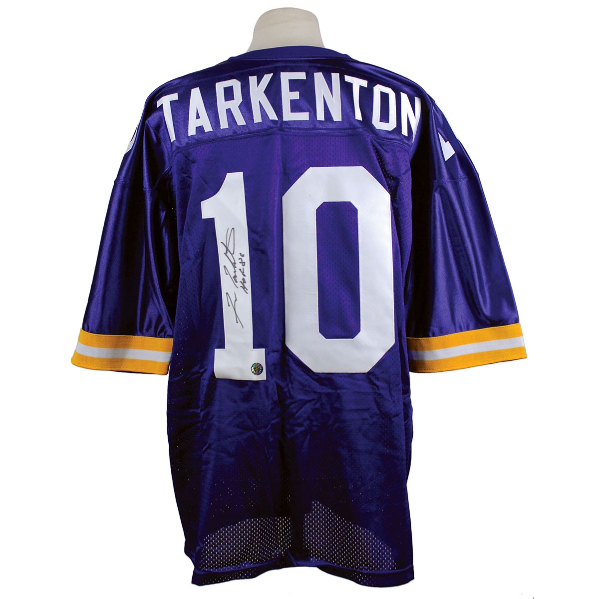 Xavier Proline replica Minnesota Vikings football jersey, with sewn on letters and numbers, signed in black felt tip on the number on the back, “Fran Tarkenton HOF 86.” In fine condition. Accompanied by a photo taken at the time of the private signing.
