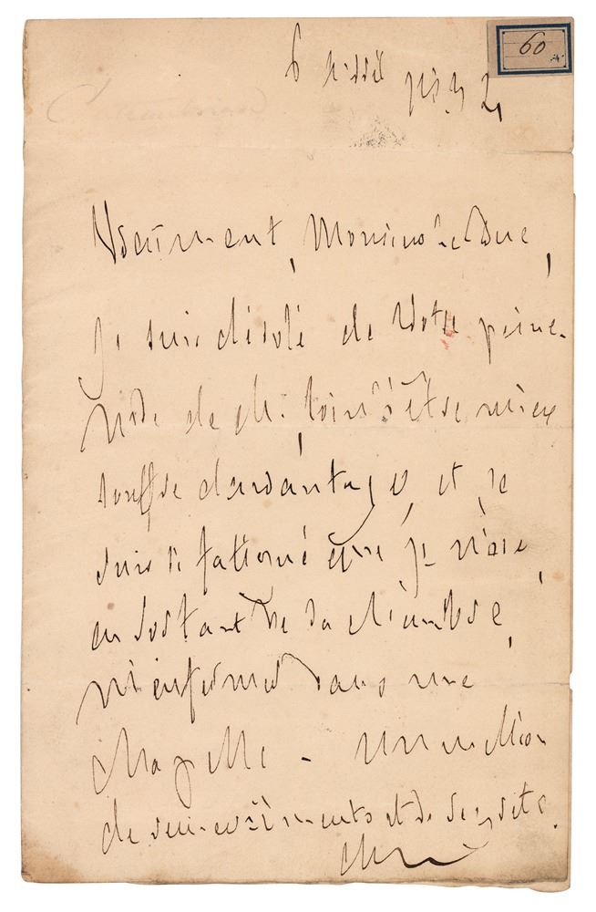 ALS in French, signed "Ch.," one page, 5 x 7.75, April 6, 1834. Handwritten letter to the "Duc de Noailles," in part (translated): "Really, Monsieur le Duc, I am sorry for your trouble. Mad. de Ch., far from being better, suffers more, and I am so tired that I dare not, on leaving the room, lock myself in a chapel." Addressed on the integral leaf in Chateaubriand's hand. In fine condition, with a split to the hinge and some paper loss to the integral address leaf.