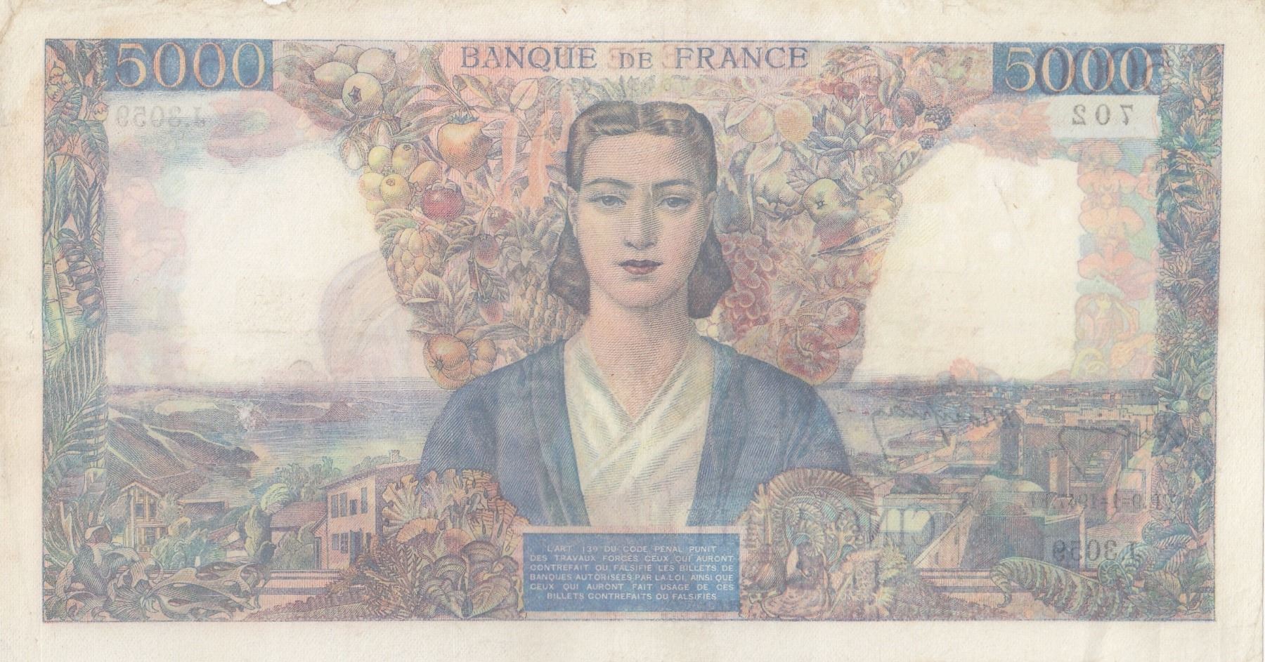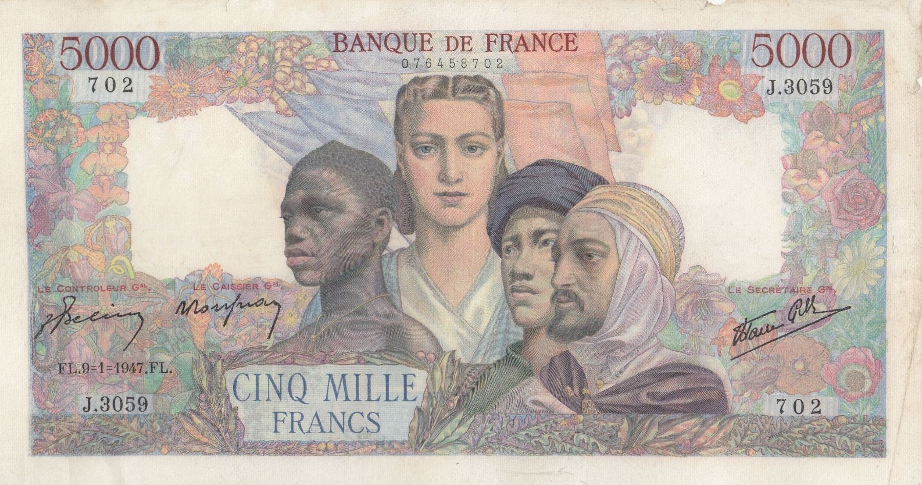 France, 1.000 Francs, 1947, VF, p103cbr/serial number: 702/J.3059, pressed, As shown in the picture, there are two small cuts in the upper and right frame.