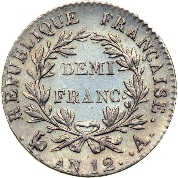 France. ½ Franc, AN 12-A (Paris). KM-648.1; Gad-394. Napoleon I (Bonaparte, Premier Consul). Bust right. Reverse: Value within wreath. Toned. NGC graded About Uncirculated, Details (Surface Hairlines).