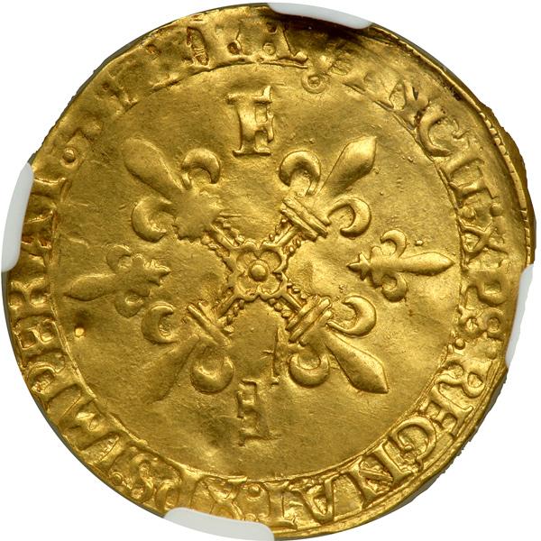 France. 1 Ecu d'or, ND. Fr-345. Francois I, 1515-1547. Crowned arms, with small radiate sun above. Reverse: Cross with two F's and two lis in angles. NGC graded VF-30.