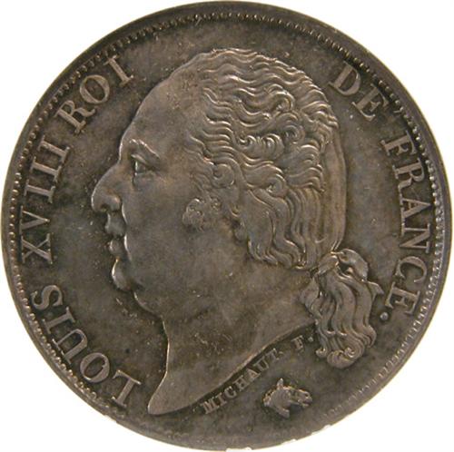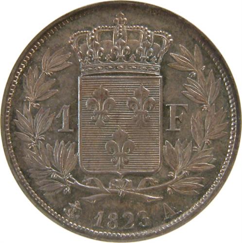 1 Franc 1823A NGC MS-64. This is a very strongly struck piece with great lustre on near flawless surfaces whit mirrored fields. It is attractively toned in light golden mauves with iridescent blue overtones