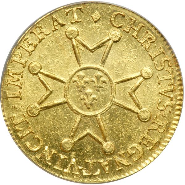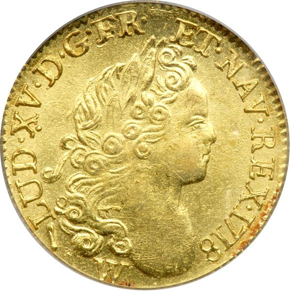 France. 1 Louis d'or, 1718-W (Lille). Fr-453; KM-438.18; Gad-336. Louis XV, 1715-1774. Young laureate head right. Reverse: Maltese cross. A pleasing lustrous example. PCGS graded MS-63.