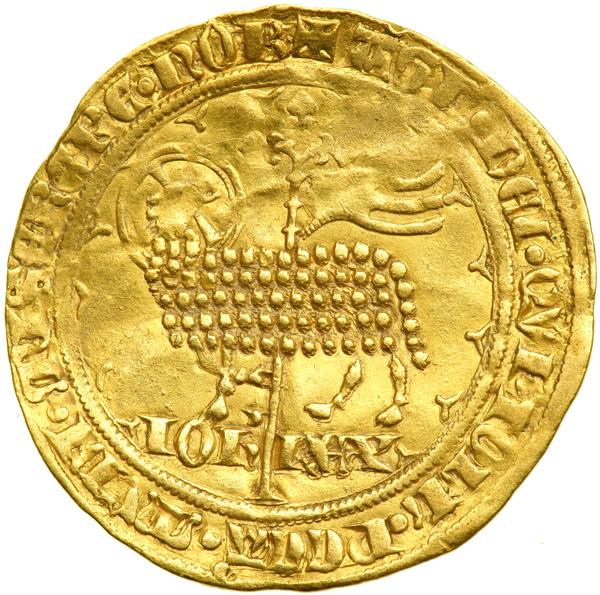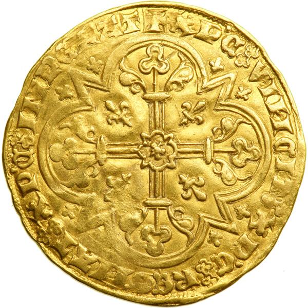 France. 1 Mouton d'or, ND. Fr-280. Jean II Le Bon, 1350-1364. Lamb and cruciform staff with flying banner. Reverse: Floriated cross in quadrilobe, fleurs de lis in angles. Mount removed and bent. NGC graded Very Fine, Details.