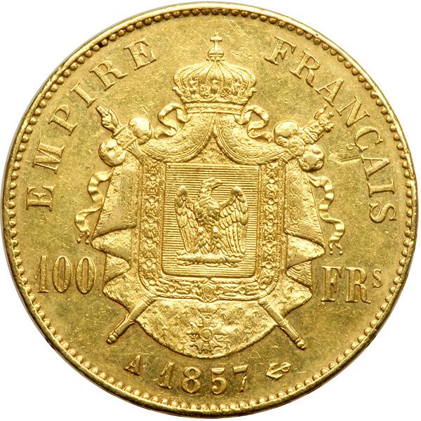 France. 100 Francs, 1857-A. Fr-569; KM-786.1. Weight 0.9334 ounce. Napeleon III. Bare head right. Reverse: Imperial arms. Lightly cleaned with minor edge bump. Very Fine.