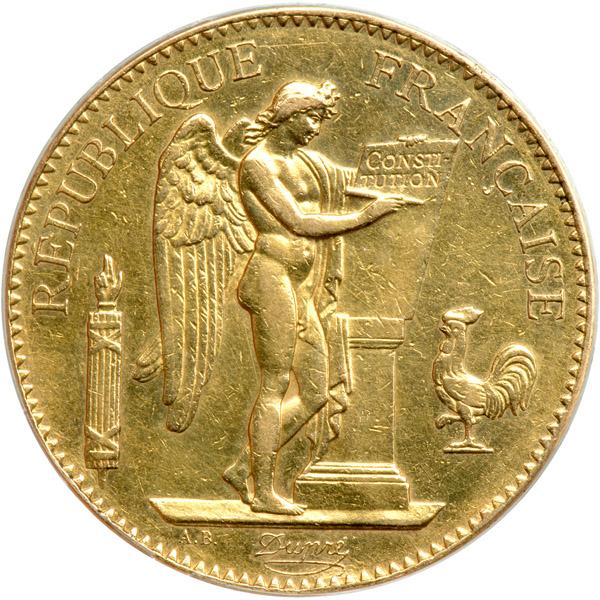 France. 100 Francs, 1878-A. Fr-590; KM-832. Weight 0.9334 ounce. Third Republic. First year of issue. Angel inscribing the Constitution on a tablet. Reverse: Value and date in wreath. Lightly cleaned. PCGS graded Genuine. Our grade, Very Fine to Extremely Fine.