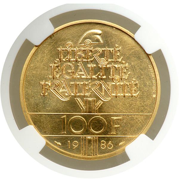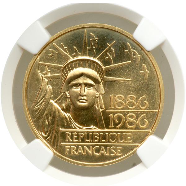 France. 100 Francs, 1986. Fr-602; KM-960b. Weight 0.5028 ounces. Statue of Liberty. NGC graded MS-67.