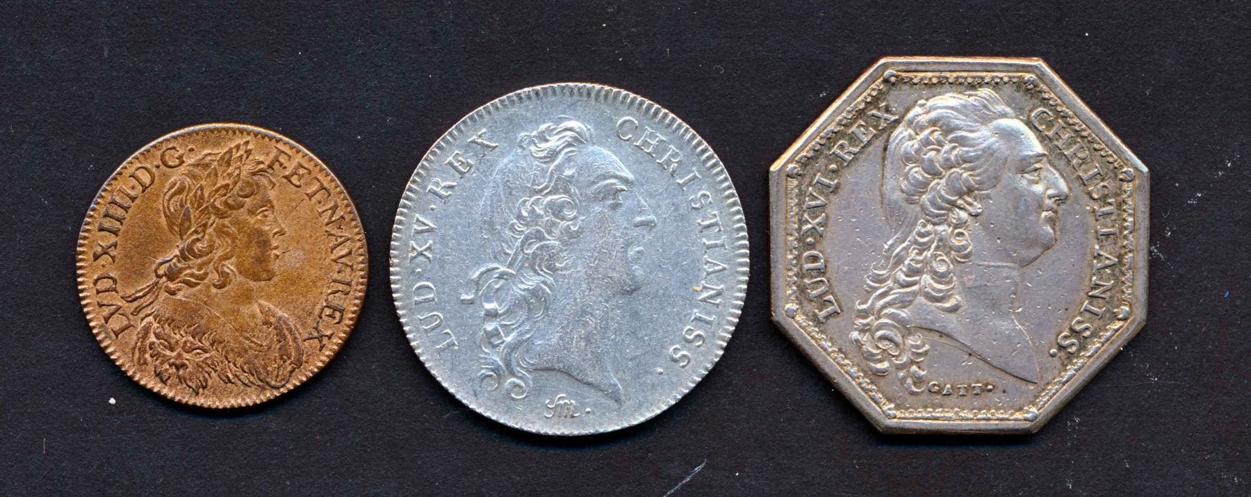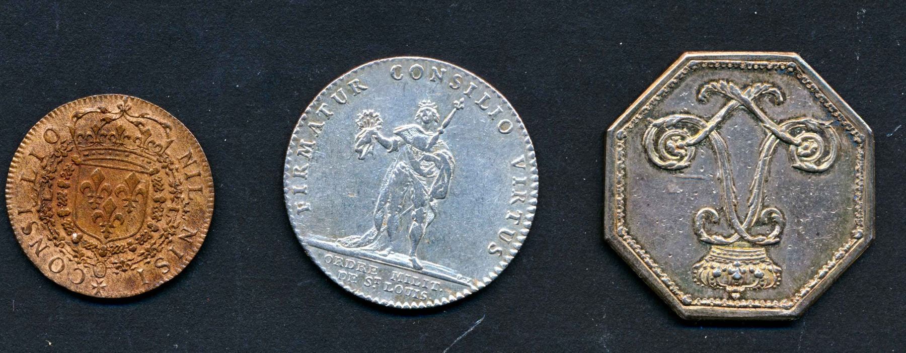 1 x Louis XIIII Nil Nisi Consilio token excellent surfaces EF/AU, 1 x Louis XV Military Order of St-Louis token Prier #714E 9.46 gm. AR-30 mm.VF+ and a Rare Octagonal Louis XVI Household token AR-34 12.06 gm. EF.