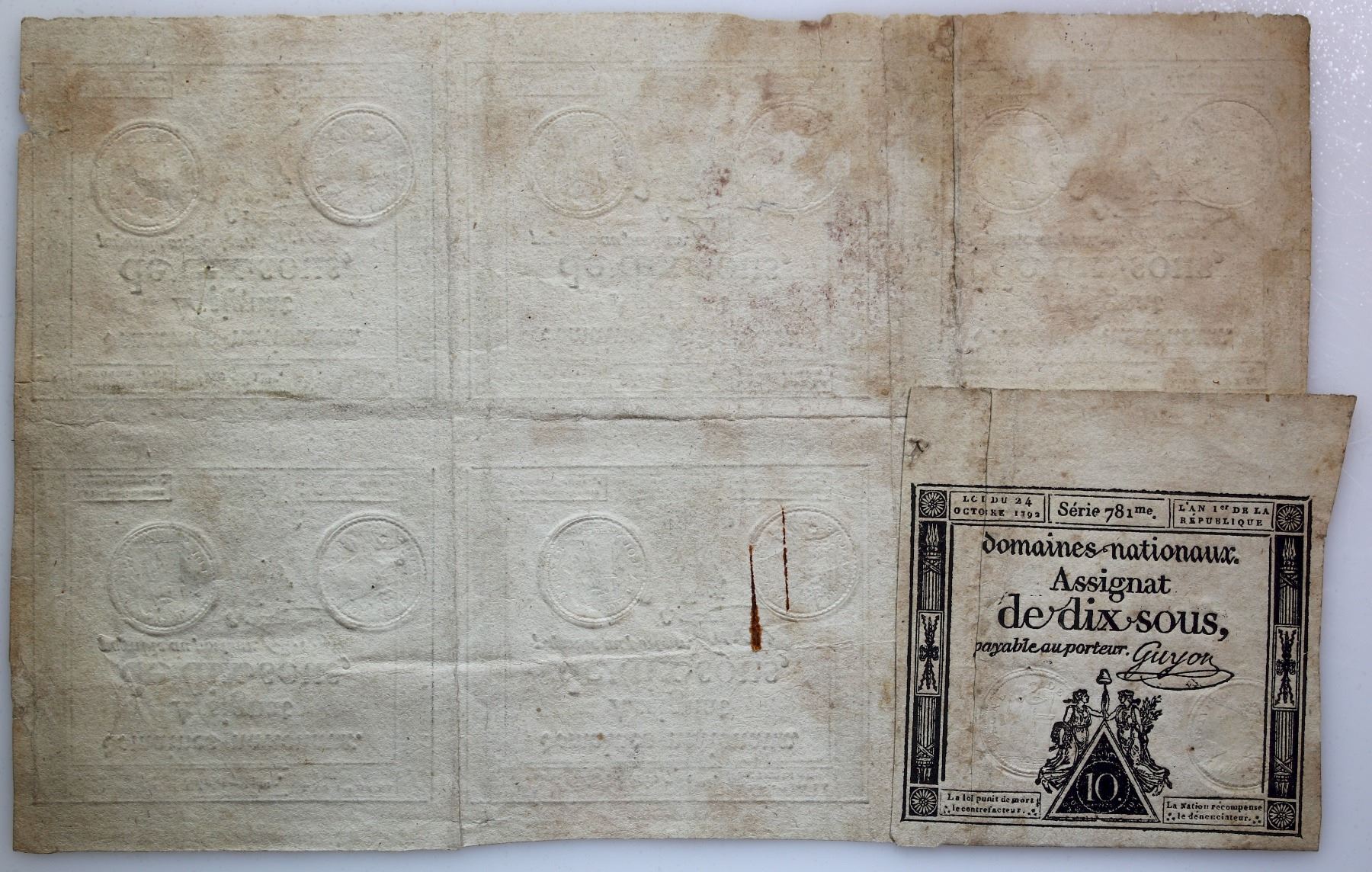 France; 1792-1793 Original Uncut Sheet of 20 Assignat de Dix sous Payable au Porteur. Sheet of 7 Uncut notes.