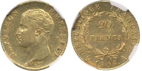 France; 1806-A Gold 20Fr (Paris Mint), NGC AU58.