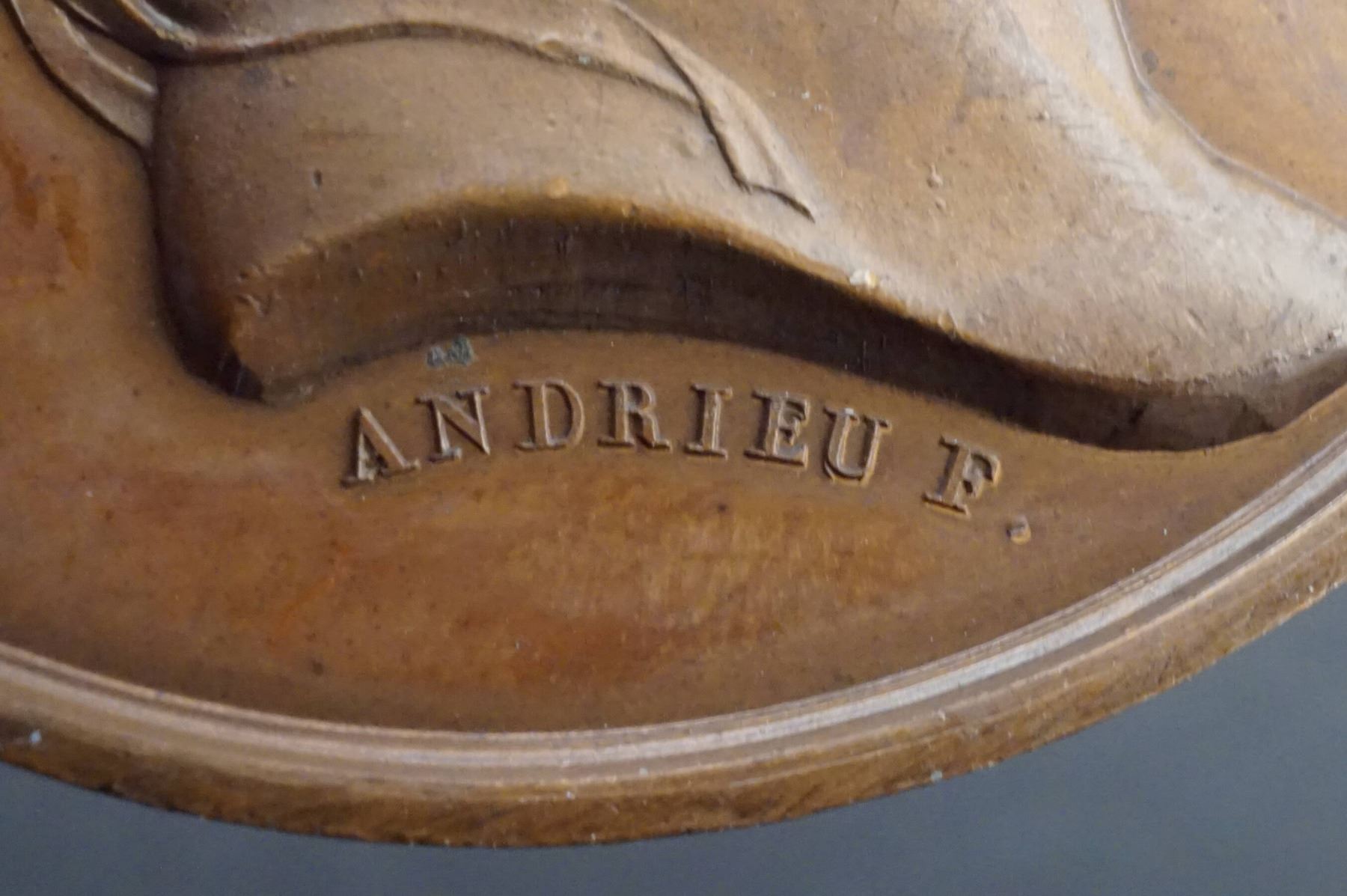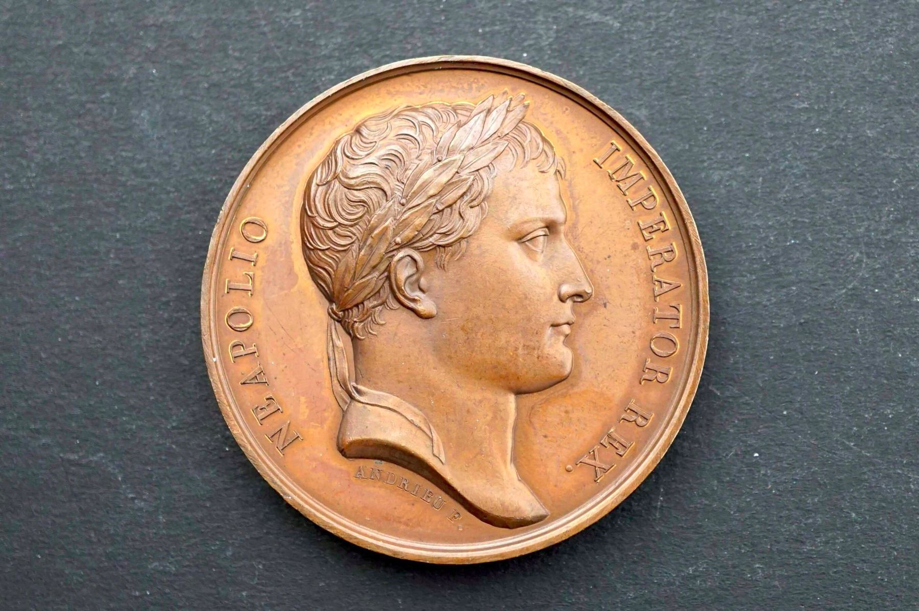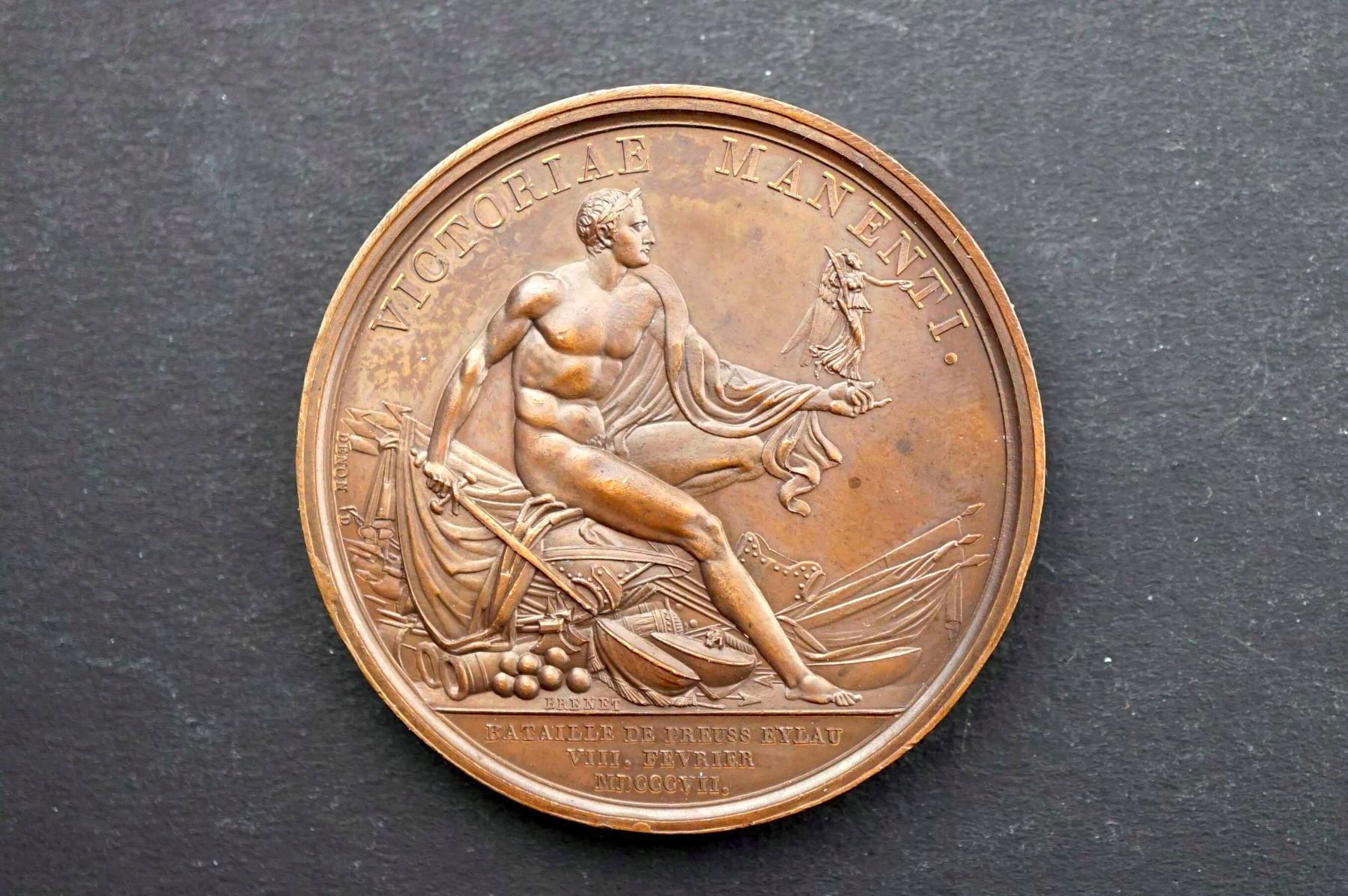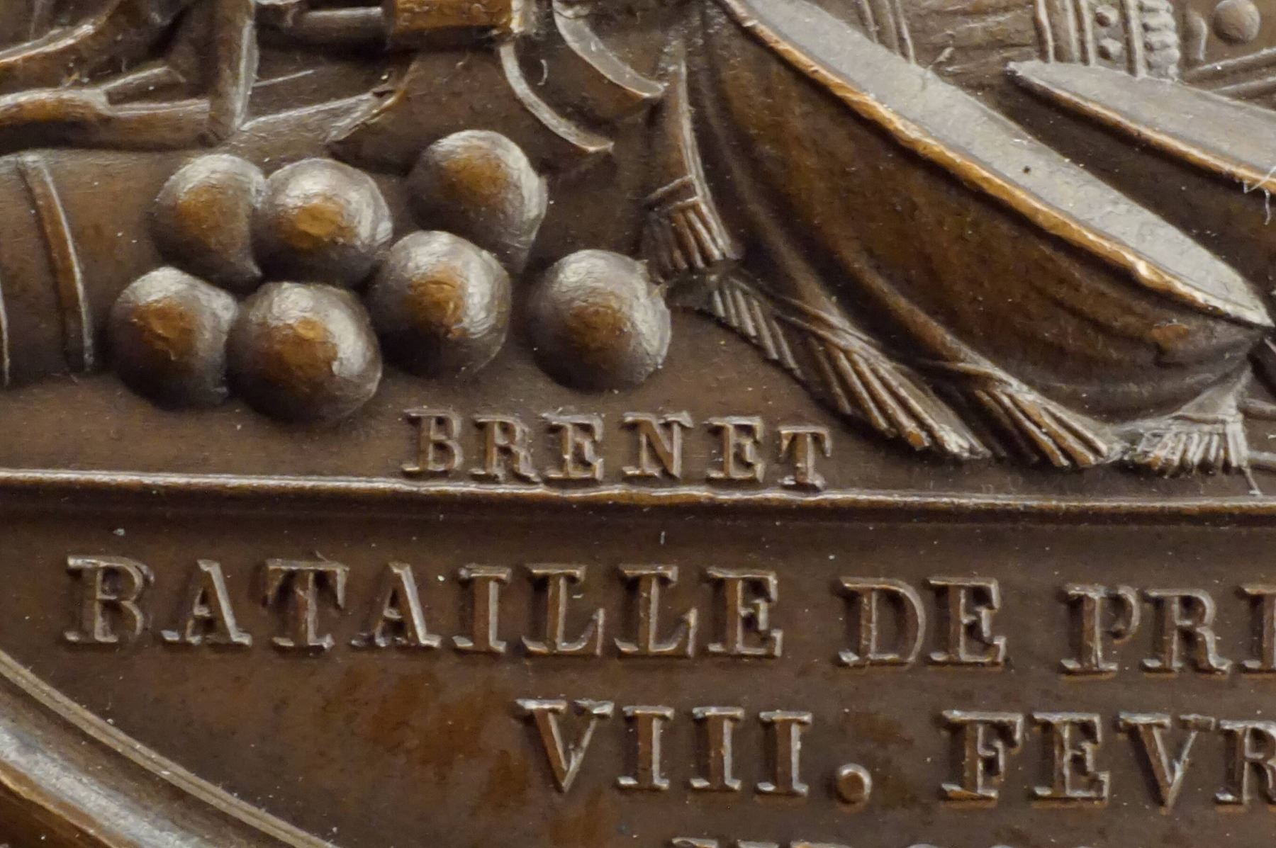 Napoleon facing right w/titles by Andrieu Rev: Battle of D'Eylau Napoleon seated on spoils of war, holding Nike by Brenet G-75, FDC AE-41, 36.0 grams. edge: Pointing finger w/CUIVRE (1845-1860) Restrike