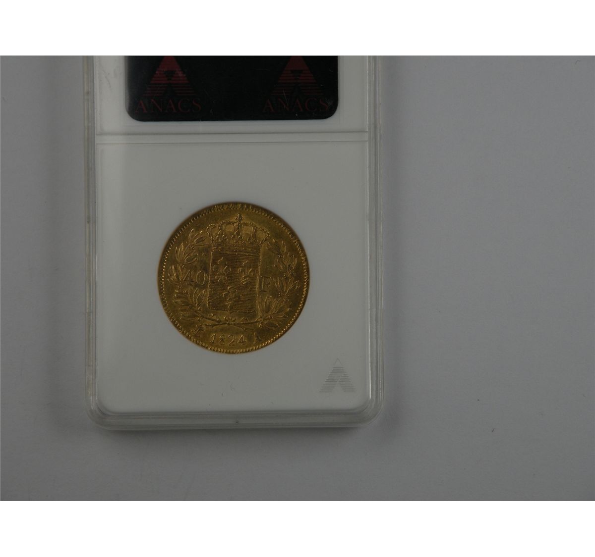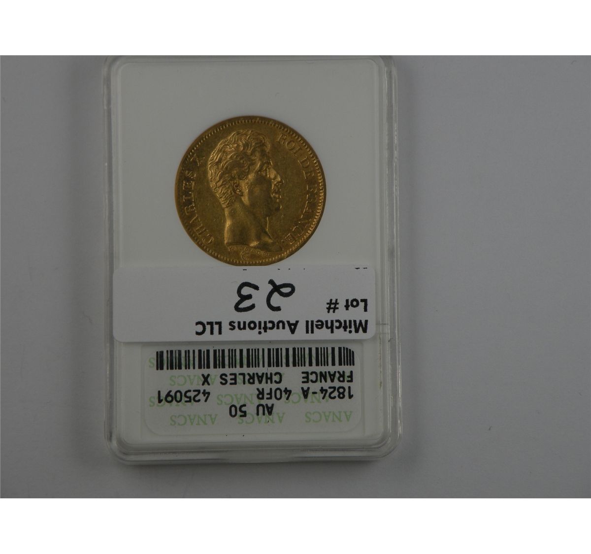 France, 1824-A 40 Franc Gold. (.3734 oz AGW) ANACS AU50. Housed in an early cache holder. Est.$525