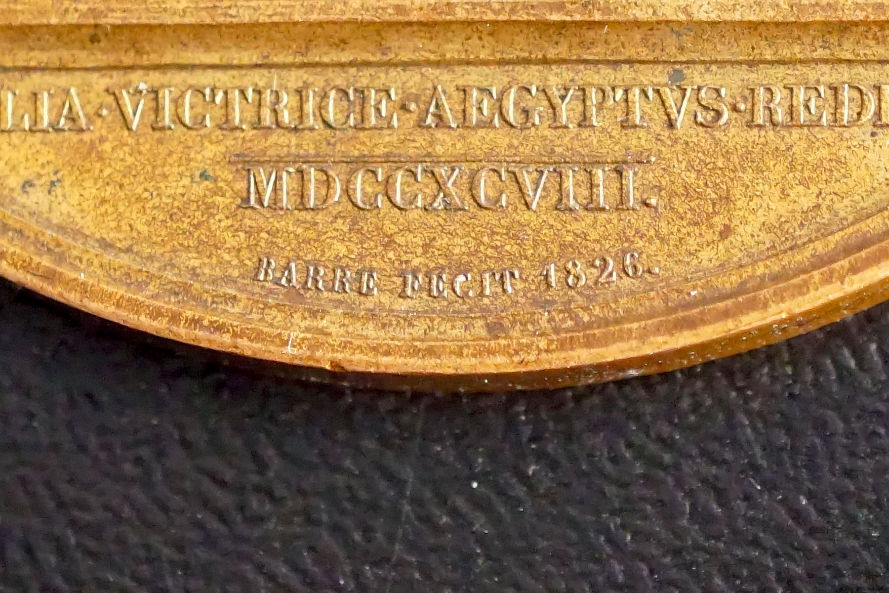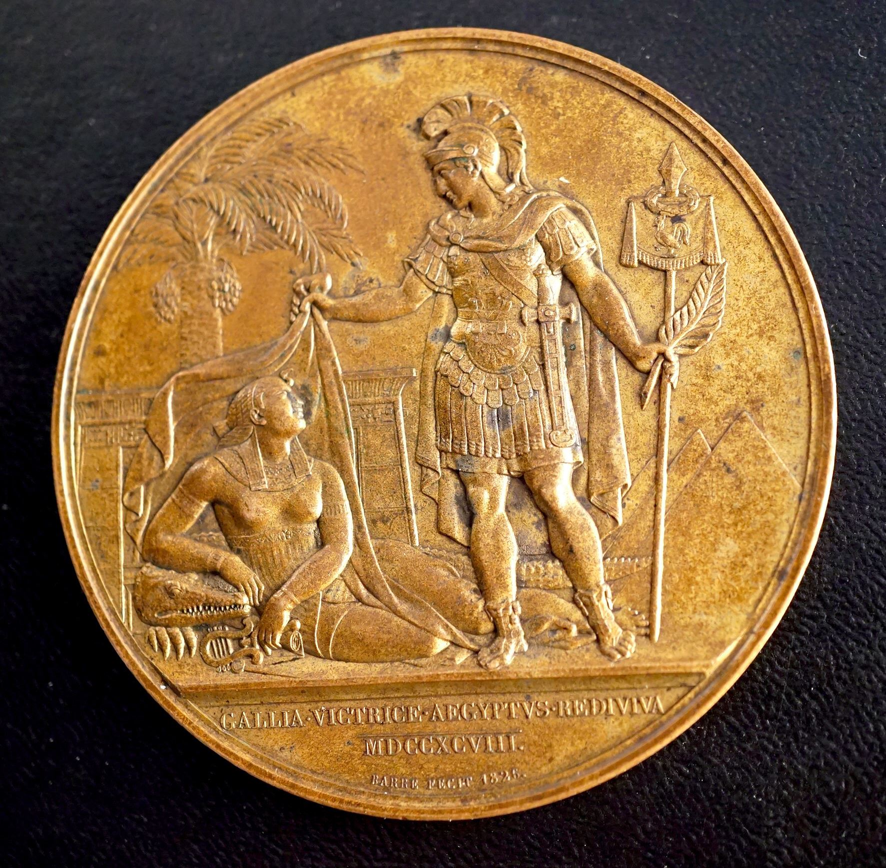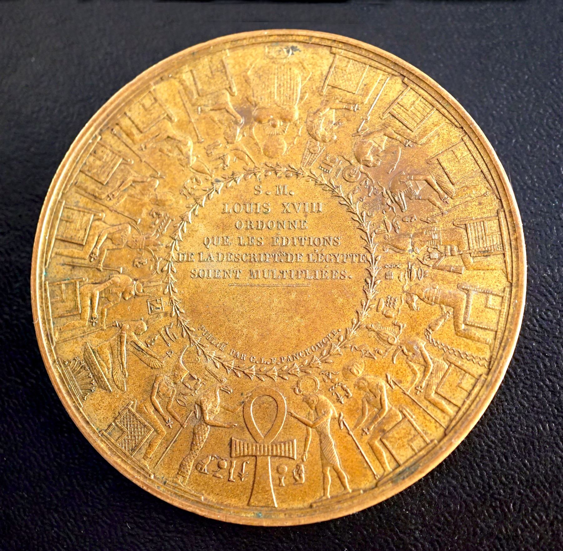 France - 1826 - Louis XVIII Order of the Edition of the Description of Egypt be Multiplied. Roman Scene in Egypt - Hieroglyphics of the Egyptian Gods.Impressive Piece! No mint mark on edge, appears to be an original striking. The obverse depicts a Romanesque scene in Egypt. Text only in exergue:GALLIA . VICTRICE . AEGYPTUS . REDIDVIVA . / MDCCCXCVIII. Signed Below: BARRE FECIT 1826. Design depicts a Roman soldier at right, holding a standard of a French rooster in left hand. In right hand, a drapery lifted from a reclining semi-nude female representing Egypt, her right hand on the snout of a crocodile head, her left holding a lyre.Behind all, a temple wall to left, with a date-palm behind. To right, pyramids in the distance. On the reverse, a small central wreath, inscribed within: S. M. / LOUIS XVIII / ORDONNE / QUE LES ÉDITIONS / DE LA DESCRIPTION DE L'ÉGYPTE / SOIT MULTIPLIÉES.Below, within the wreath: PUBLI" PAR C. L. F. PANCKOUCKE. Between the wreath and the rim, eighteen Egyptian Gods, represented by their Hieroglyphics. At bottom, an Ankh sign, dividing a small text in hieroglyphic script. A signature? Bronze, 68 mm, 117.6 grams