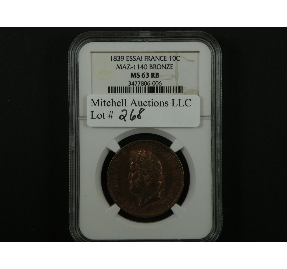 France 1839 10 Centimes Essai. MAZ-1140, Bronze. NGC MS63 RB. Reflective and retaining quite a bit of faded mint color. This French pattern coin is scarce and highly collectible albeit quite affordable. Est.$200