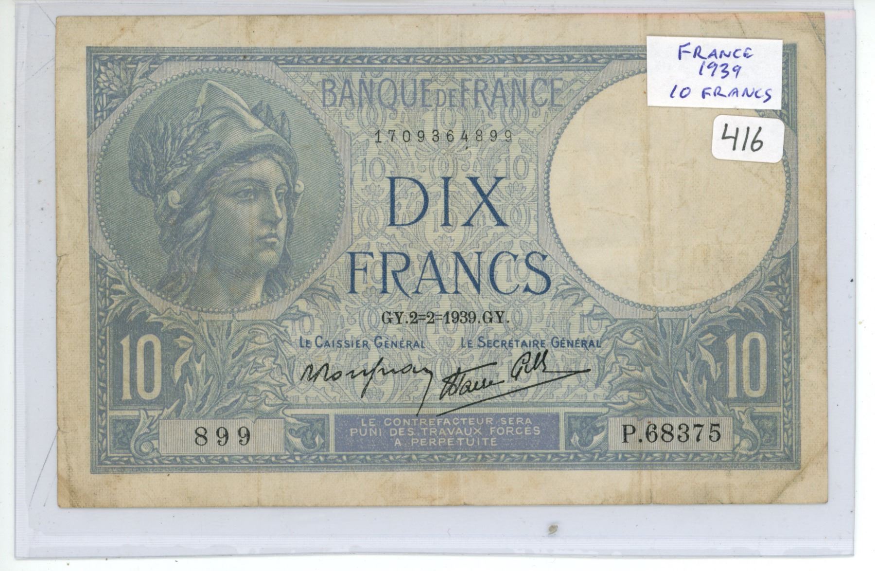 France. 1939 10 Francs. Issued the first year of World War II. VF.