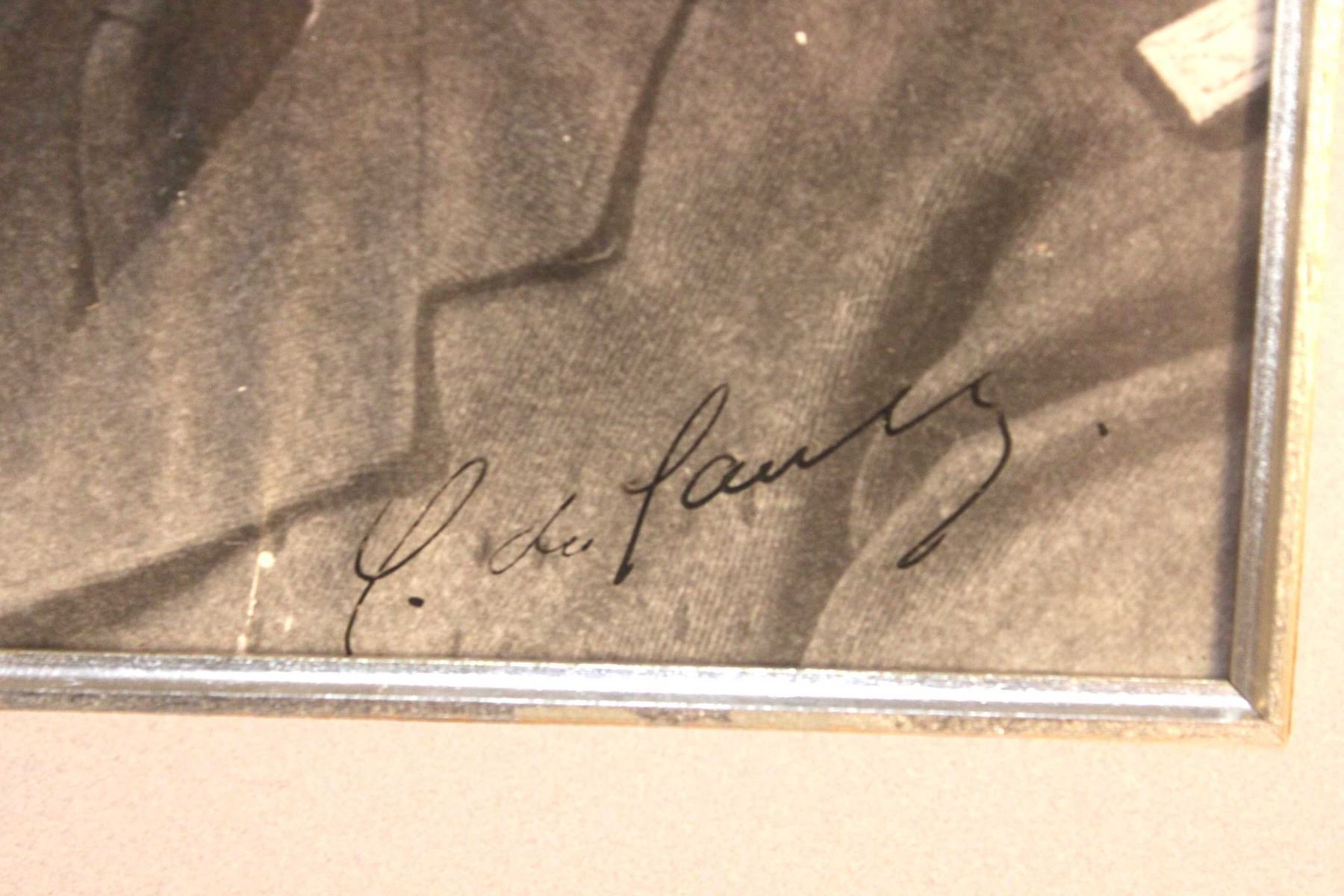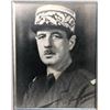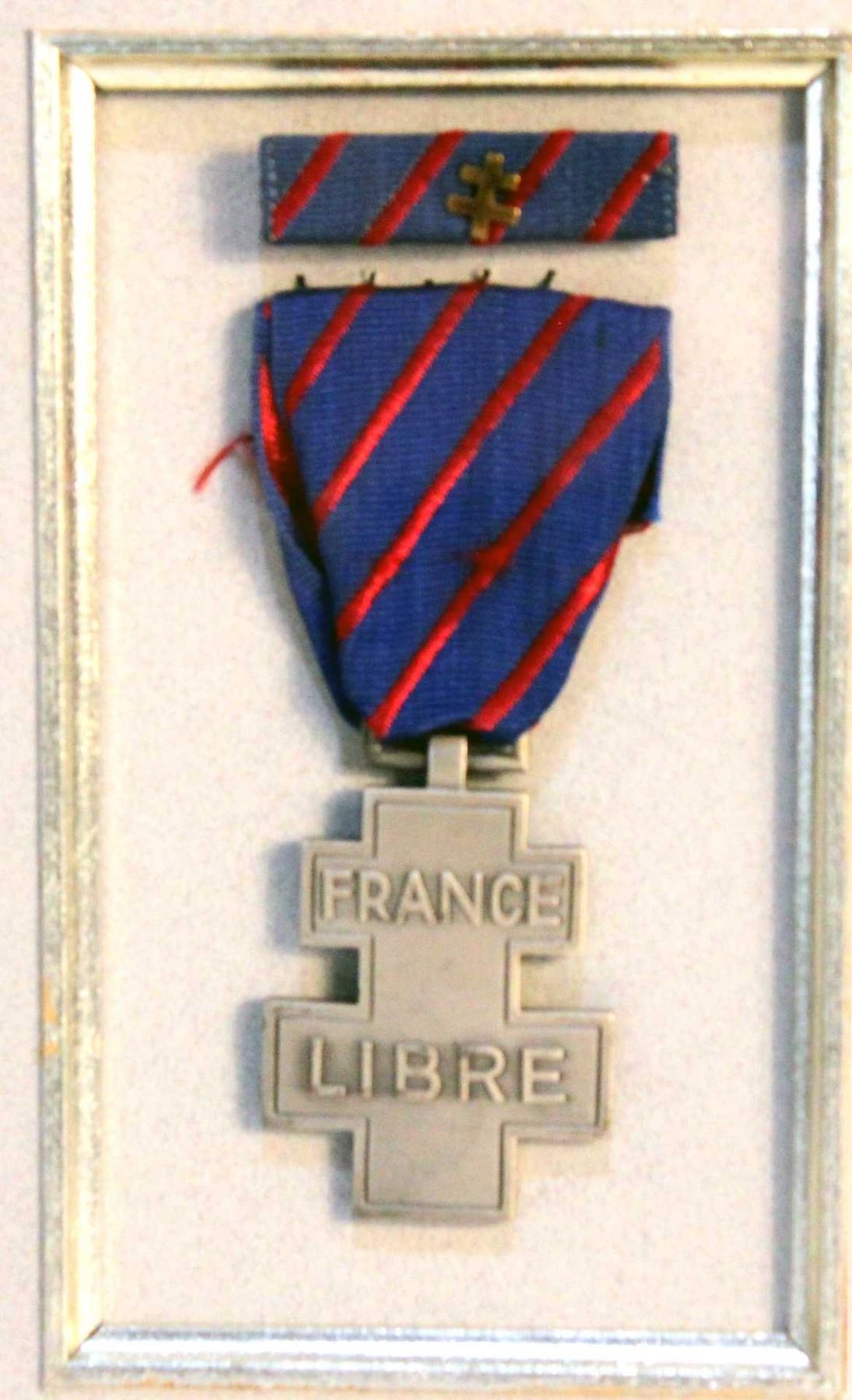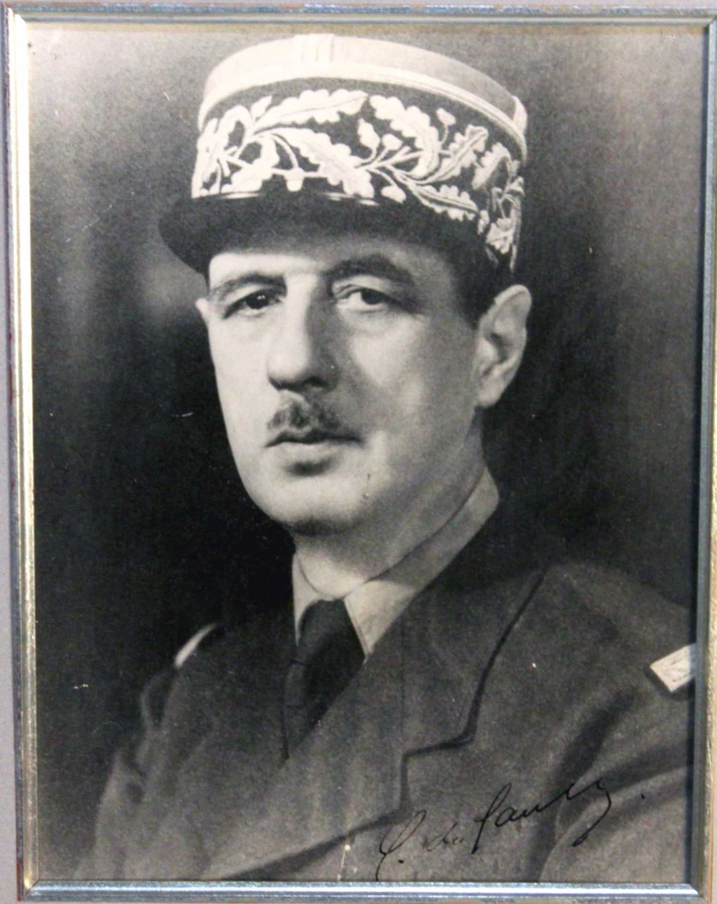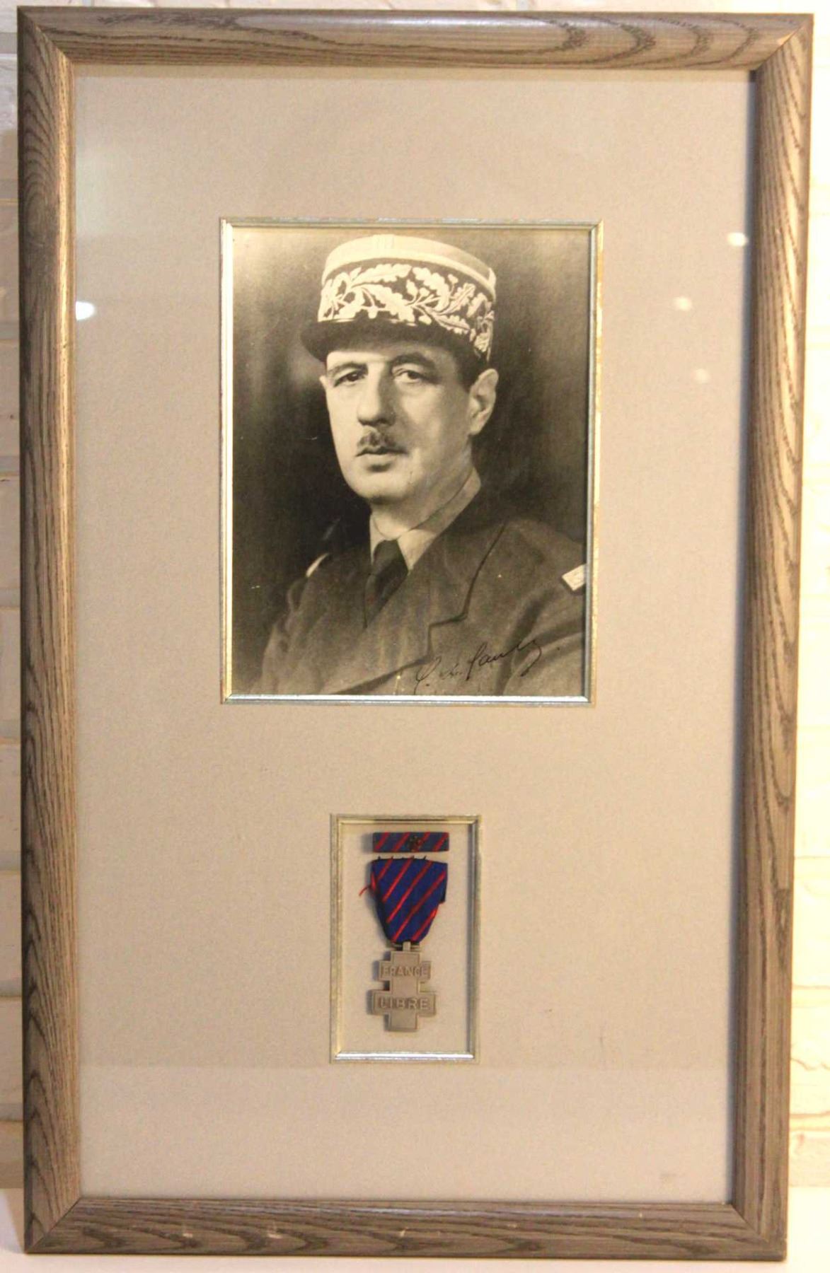 This is a framed signed black and white photograph of General DeGaulle along with the medal and bar for commemorative medal for Voluntary Service in the Free France army.