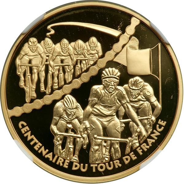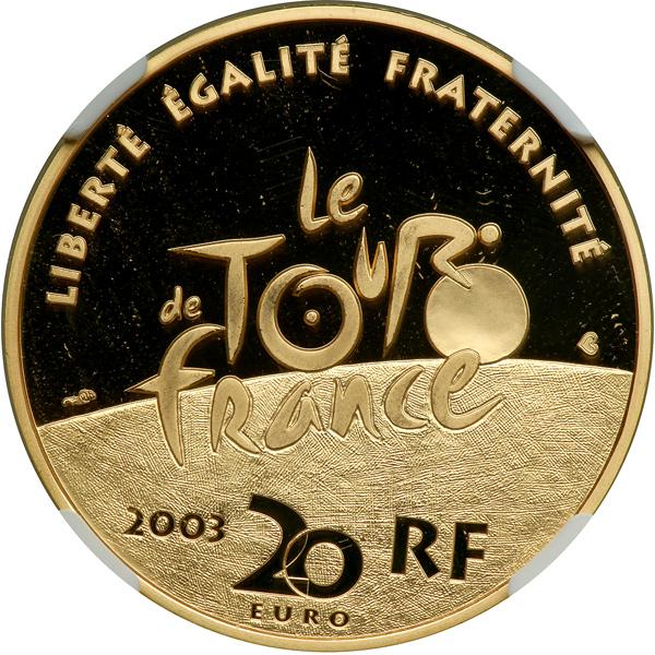 France. 20 Euro, 2003. Weight 0.5028 ounce. Tour De France. Cyclist with Flag. NGC graded Proof 70 Ultra Cameo.